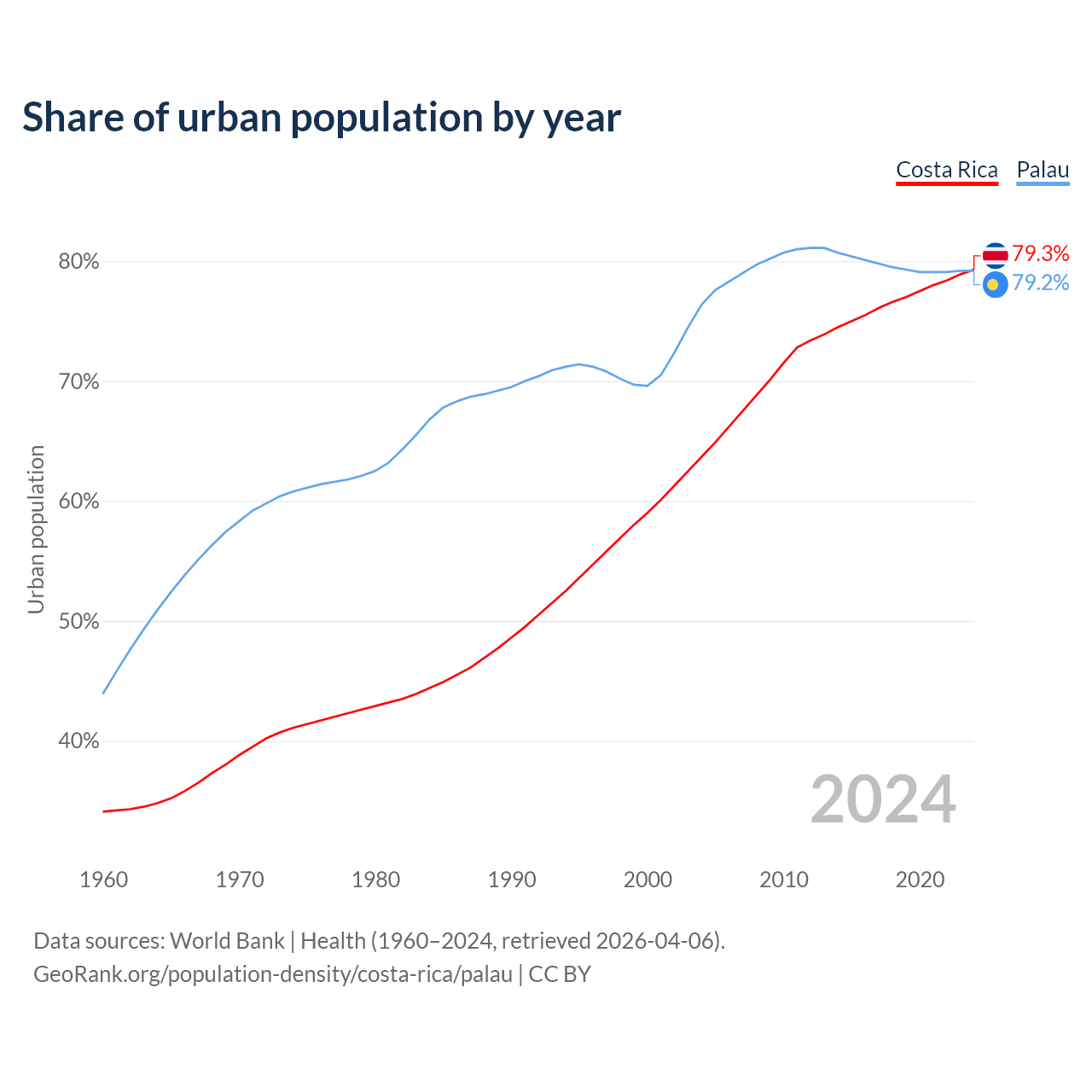 From 2004 to 2024, the share of urban population changed from 63.7% to 79.3% in Costa Rica and from 76.4% to 79.2% in Palau.