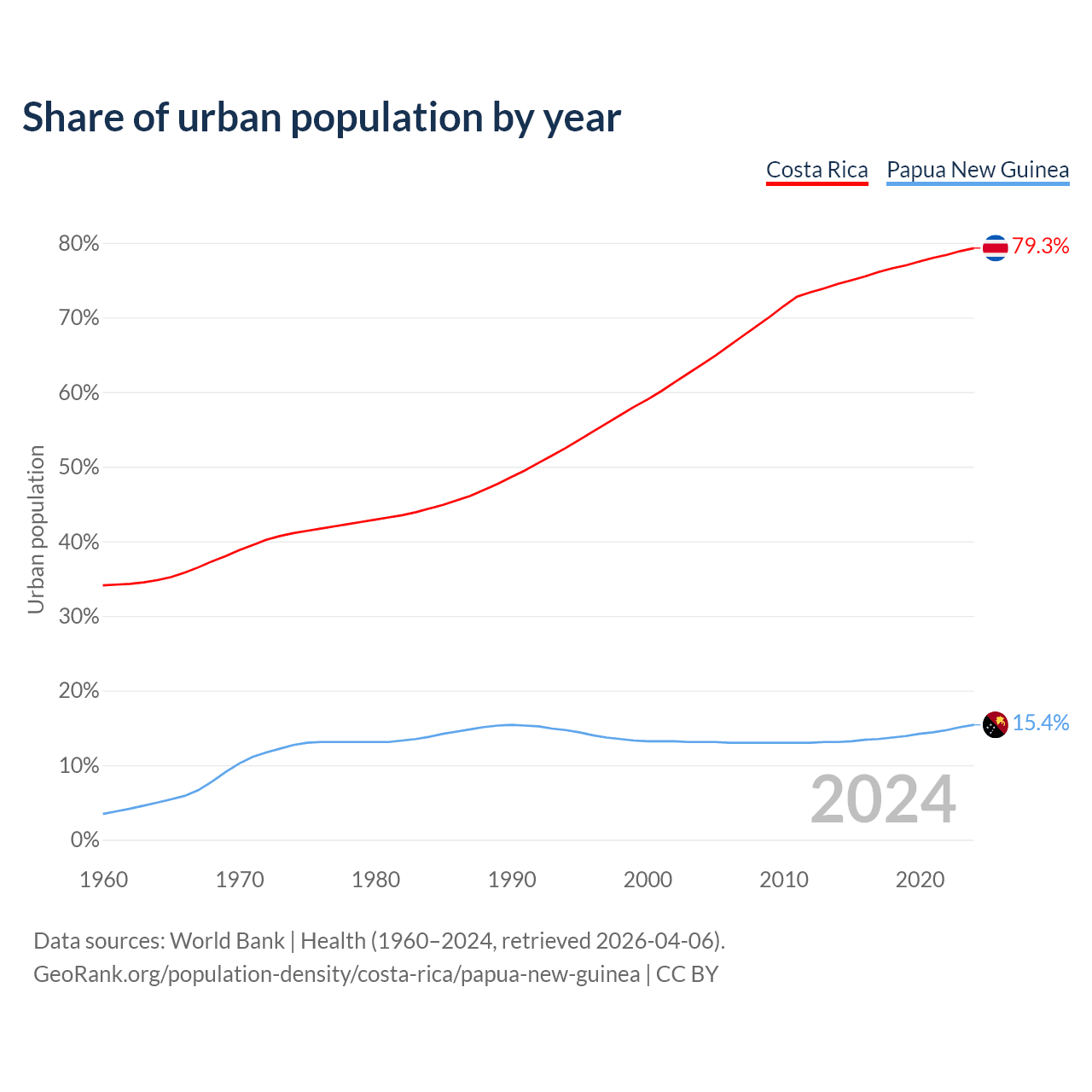From 2004 to 2024, the share of urban population changed from 63.7% to 79.3% in Costa Rica and from 13.1% to 15.4% in Papua New Guinea.