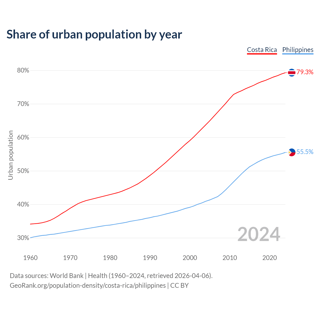 From 2004 to 2024, the share of urban population changed from 63.7% to 79.3% in Costa Rica and from 40.9% to 55.5% in the Philippines.