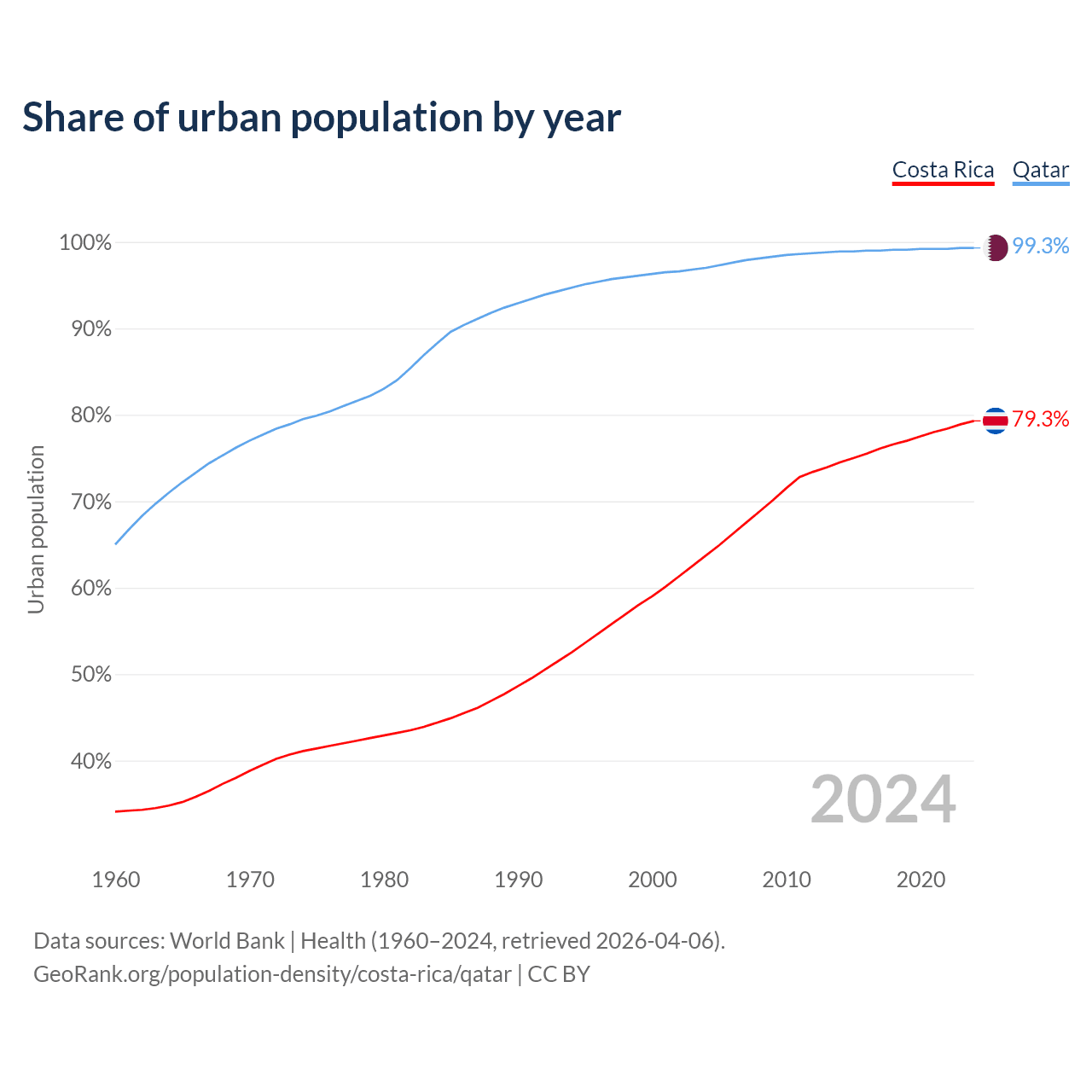 From 2004 to 2024, the share of urban population changed from 63.7% to 79.3% in Costa Rica and from 97% to 99.3% in Qatar.