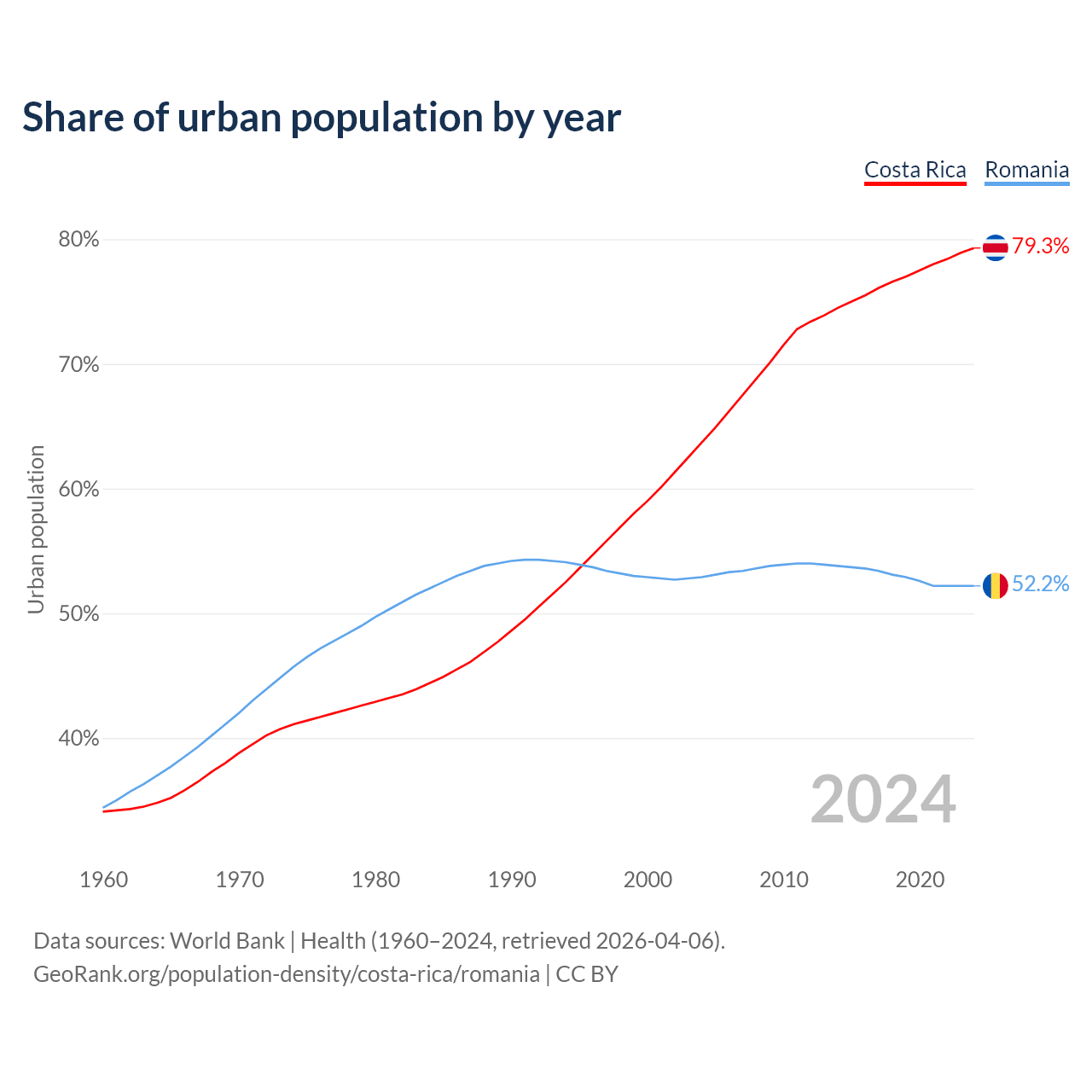 From 2004 to 2024, the share of urban population changed from 63.7% to 79.3% in Costa Rica and from 52.9% to 52.2% in Romania.