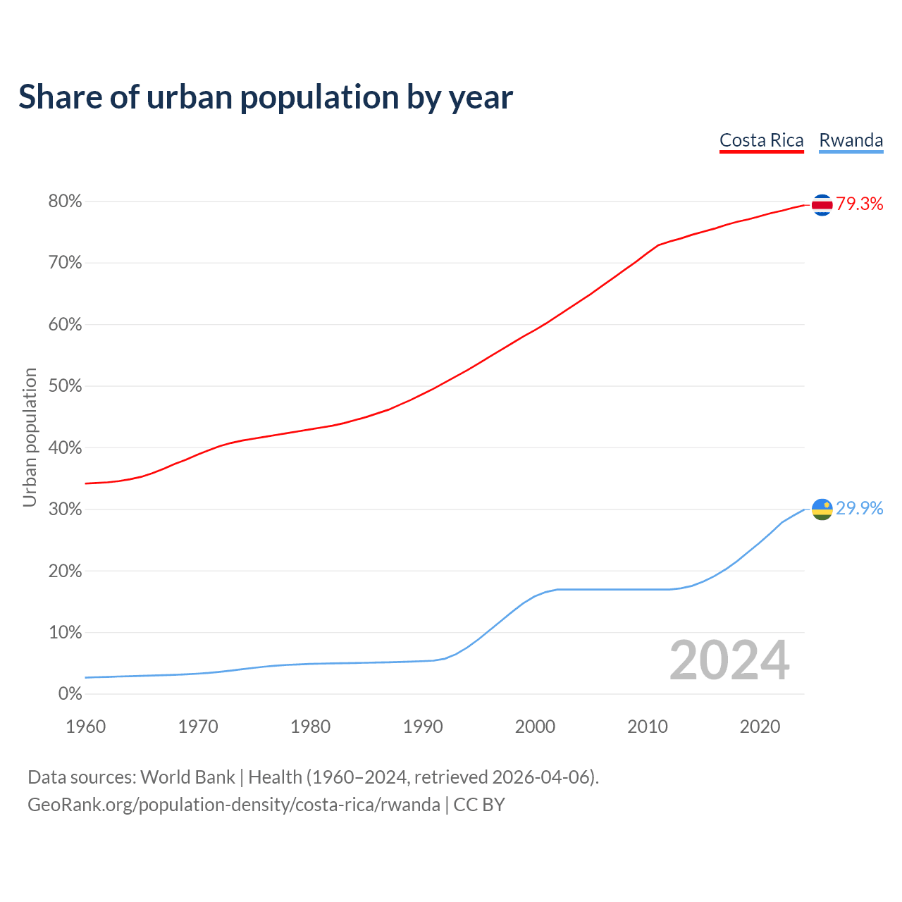From 2004 to 2024, the share of urban population changed from 63.7% to 79.3% in Costa Rica and from 16.9% to 29.9% in Rwanda.