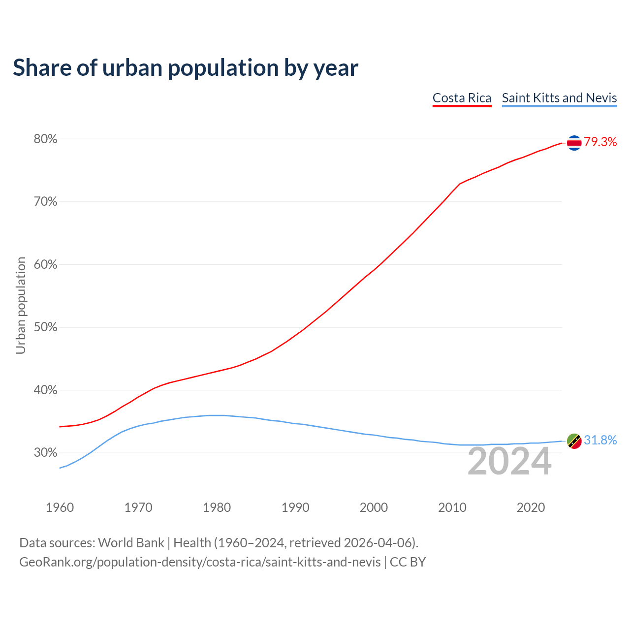 From 2004 to 2024, the share of urban population changed from 63.7% to 79.3% in Costa Rica and from 32.1% to 31.8% in Saint Kitts and Nevis.