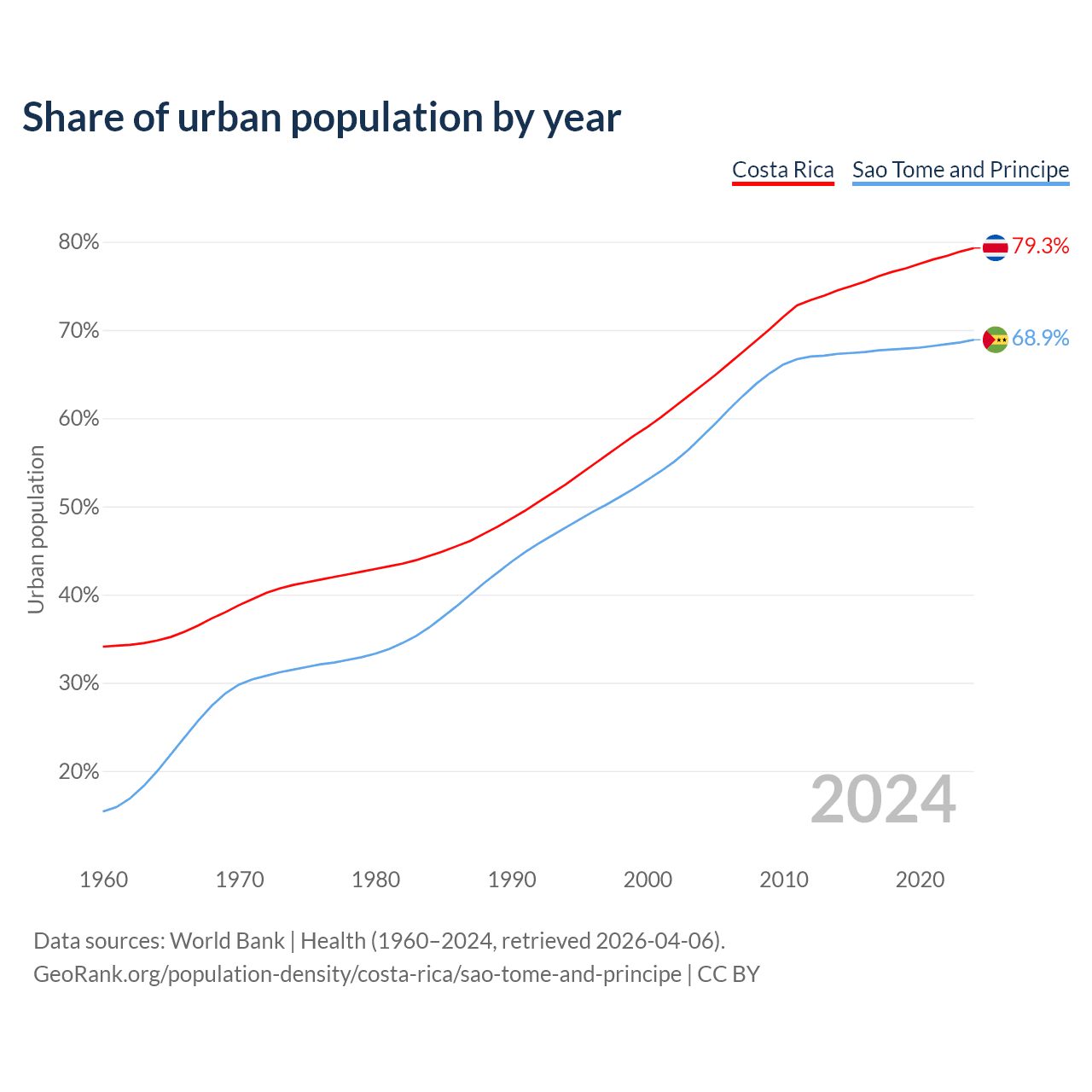 From 2004 to 2024, the share of urban population changed from 63.7% to 79.3% in Costa Rica and from 57.9% to 68.9% in Sao Tome and Principe.