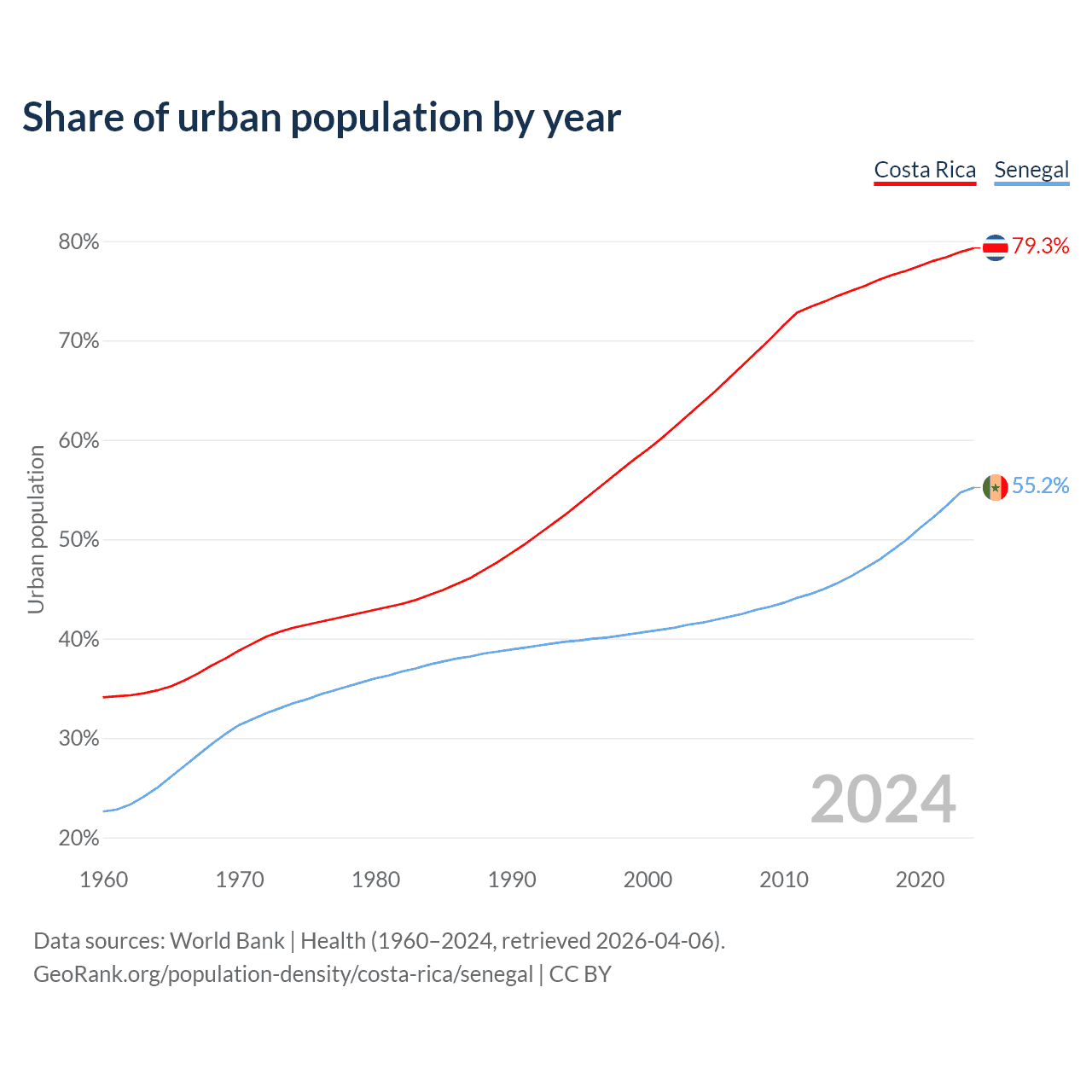 From 2004 to 2024, the share of urban population changed from 63.7% to 79.3% in Costa Rica and from 41.6% to 55.2% in Senegal.