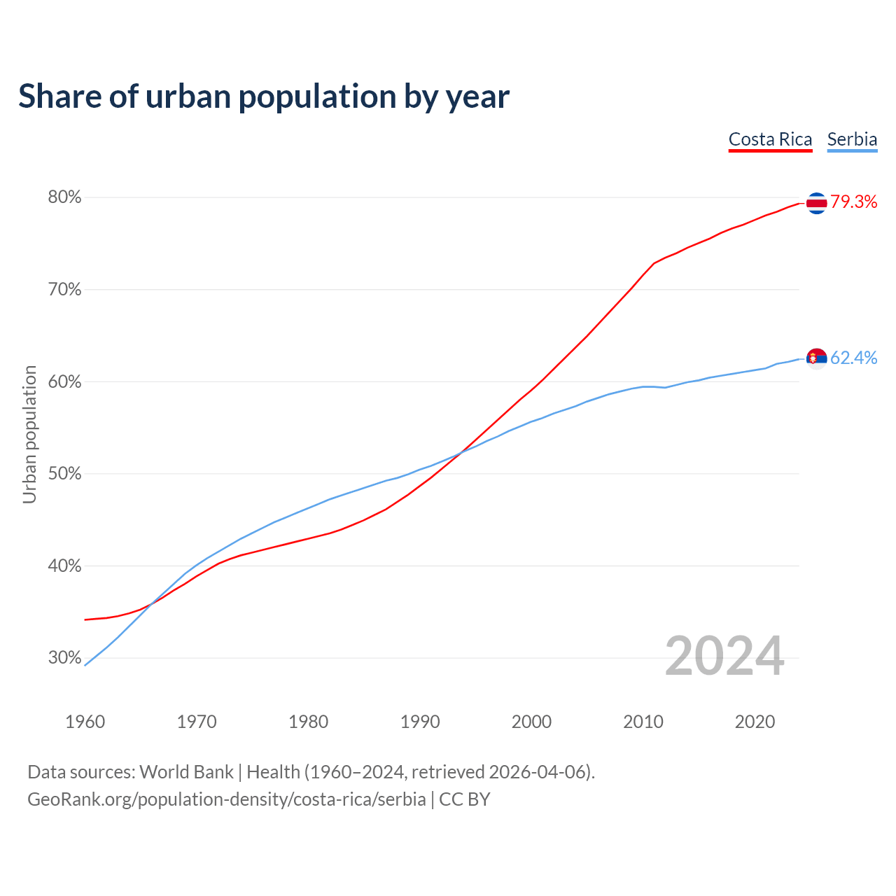 From 2004 to 2024, the share of urban population changed from 63.7% to 79.3% in Costa Rica and from 57.3% to 62.4% in Serbia.
