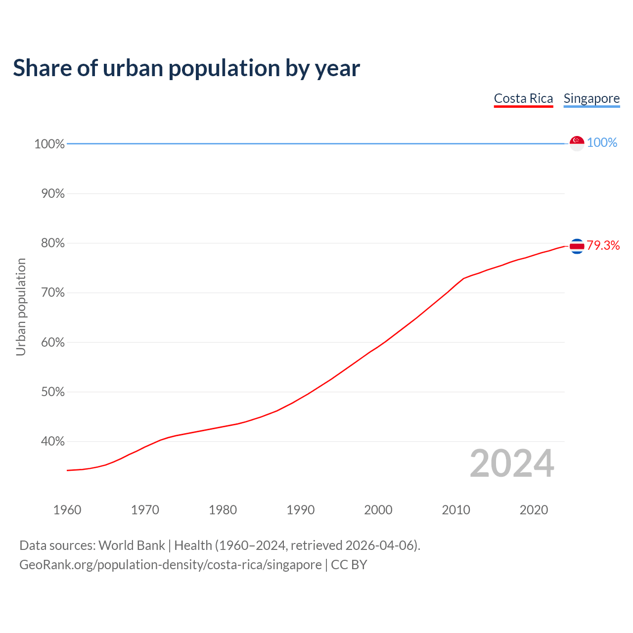 From 2004 to 2024, the share of urban population changed from 63.7% to 79.3% in Costa Rica and from 100% to 100% in Singapore.