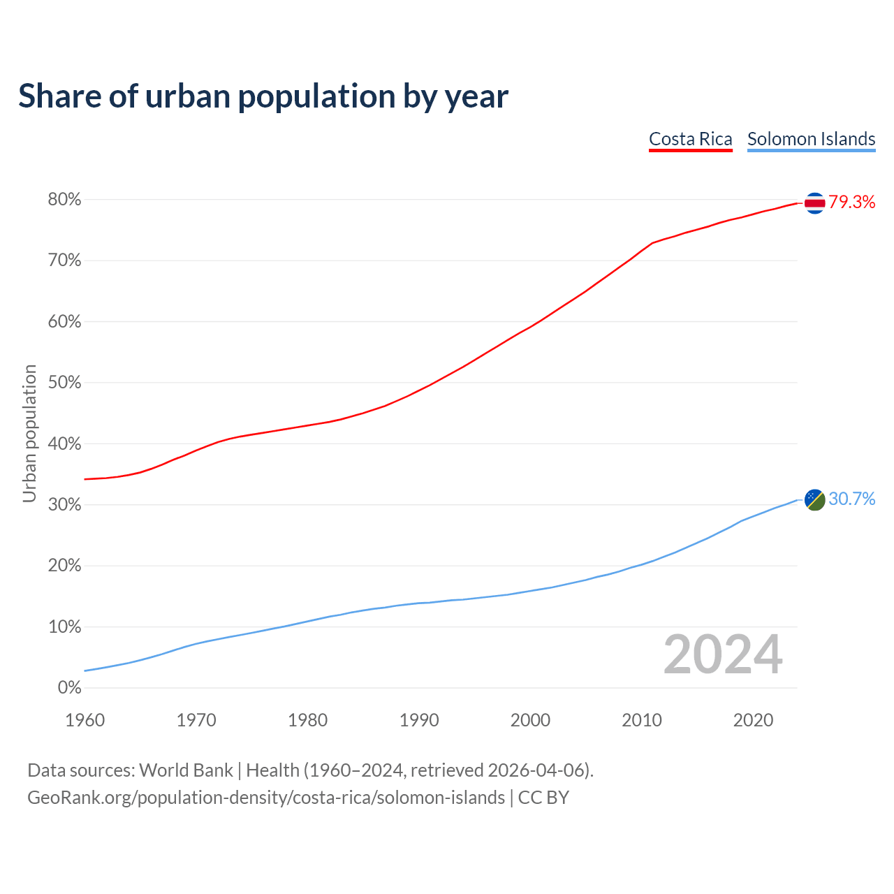 From 2004 to 2024, the share of urban population changed from 63.7% to 79.3% in Costa Rica and from 17.2% to 30.7% in the Solomon Islands.