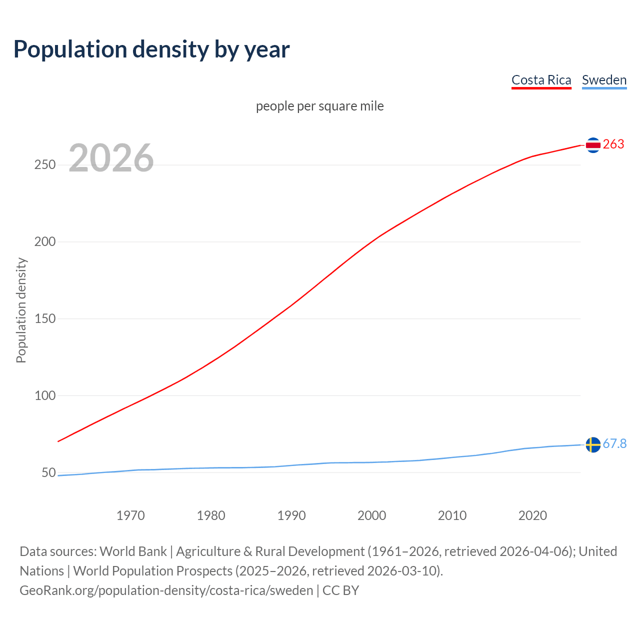 From 2006 to 2026, population density in Costa Rica increased by 19.8%, compared to a 17.5% growth in Sweden.