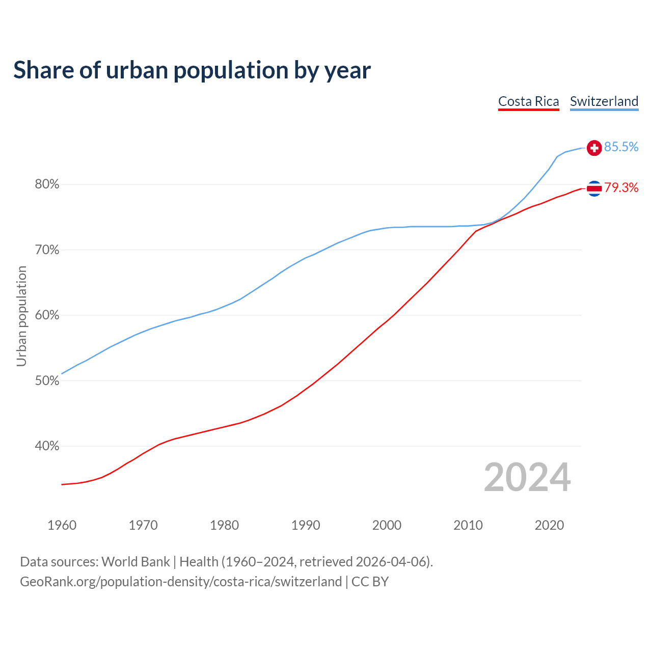 From 2004 to 2024, the share of urban population changed from 63.7% to 79.3% in Costa Rica and from 73.5% to 85.5% in Switzerland.