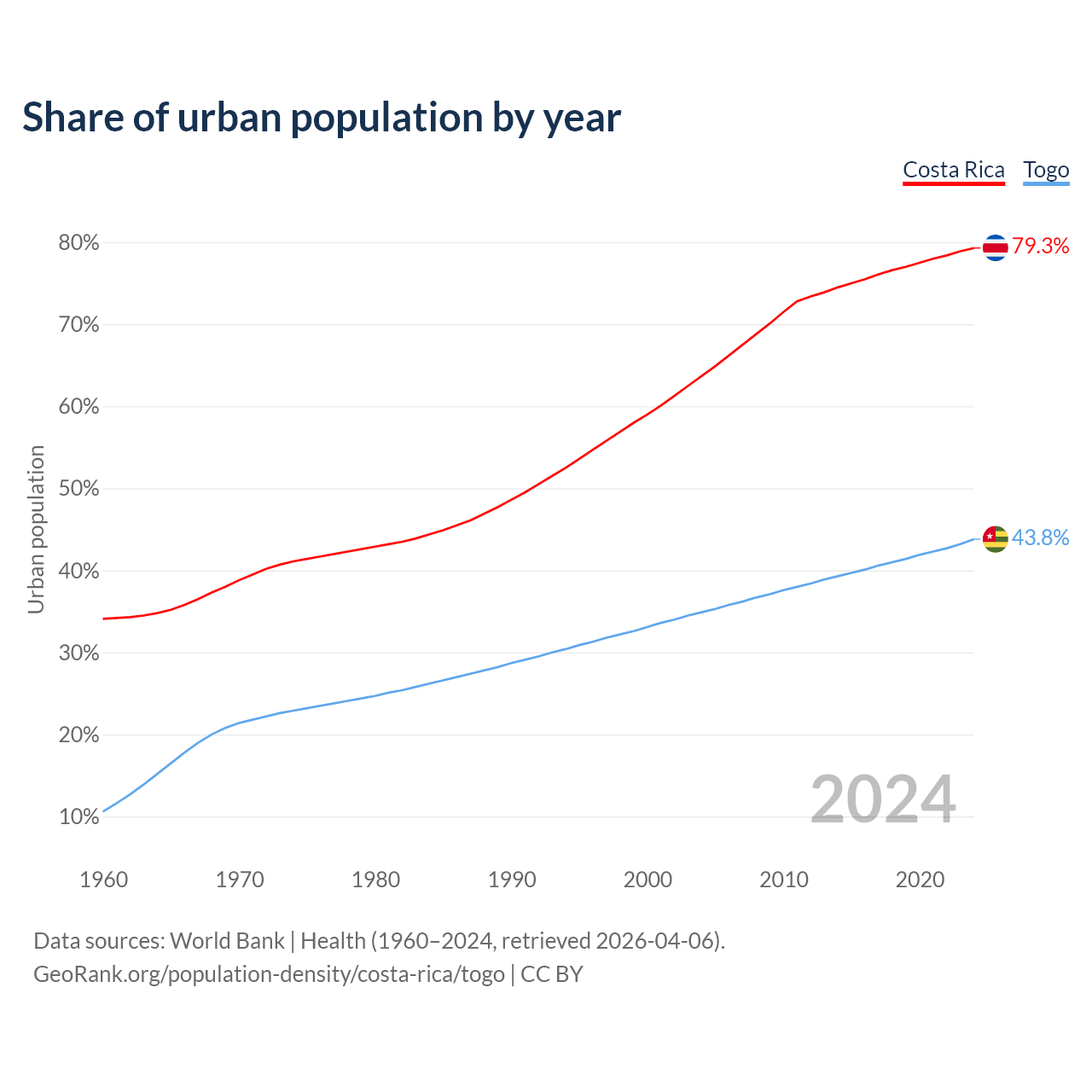 From 2004 to 2024, the share of urban population changed from 63.7% to 79.3% in Costa Rica and from 34.9% to 43.8% in Togo.