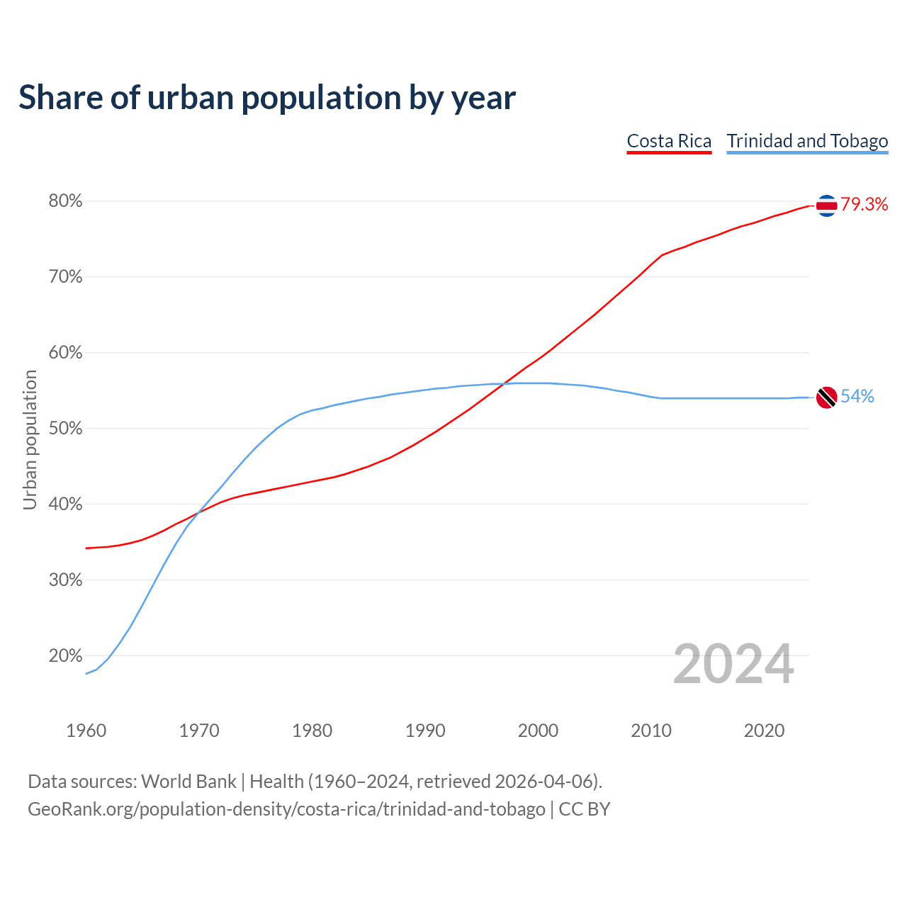 From 2004 to 2024, the share of urban population changed from 63.7% to 79.3% in Costa Rica and from 55.6% to 54% in Trinidad and Tobago.