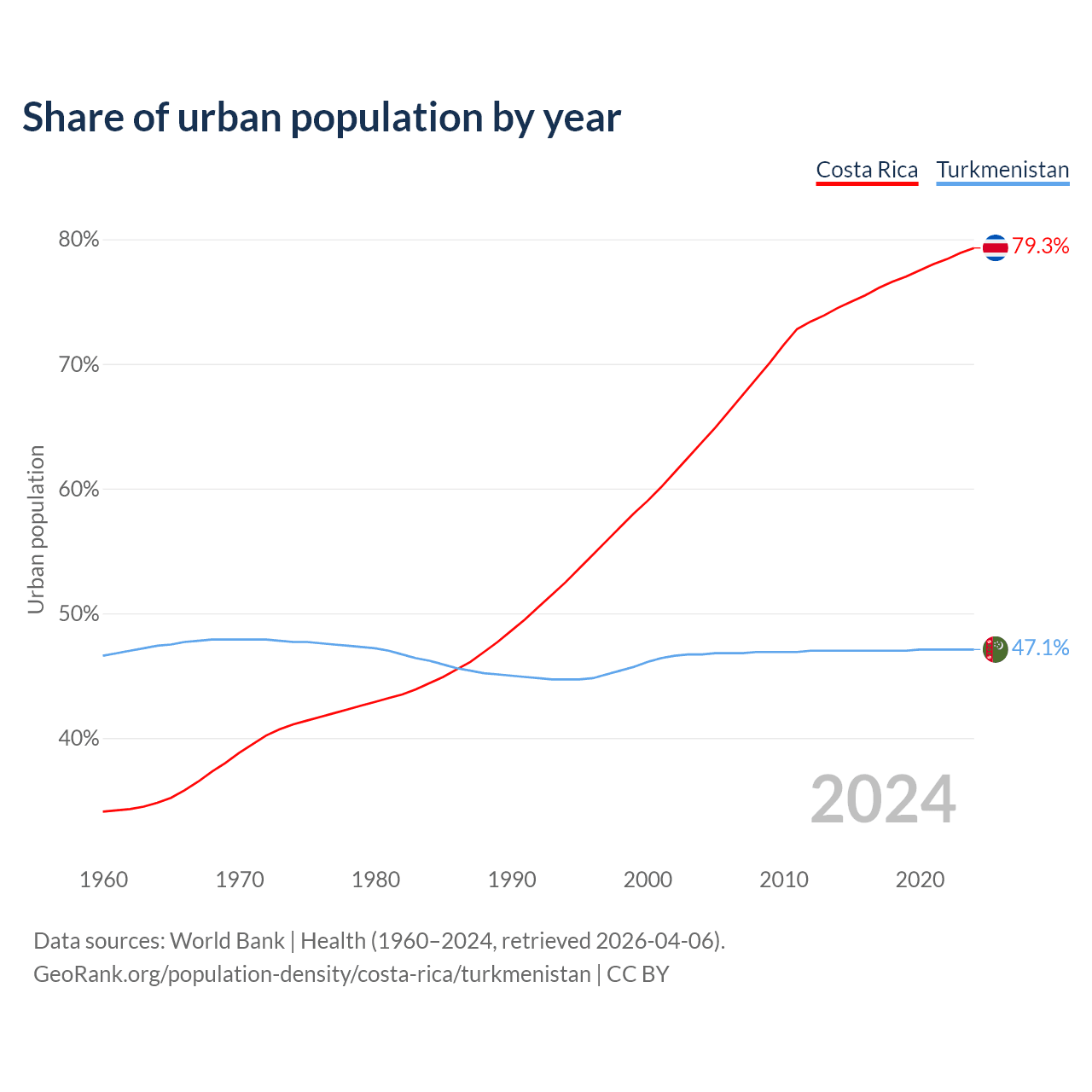 From 2004 to 2024, the share of urban population changed from 63.7% to 79.3% in Costa Rica and from 46.7% to 47.1% in Turkmenistan.