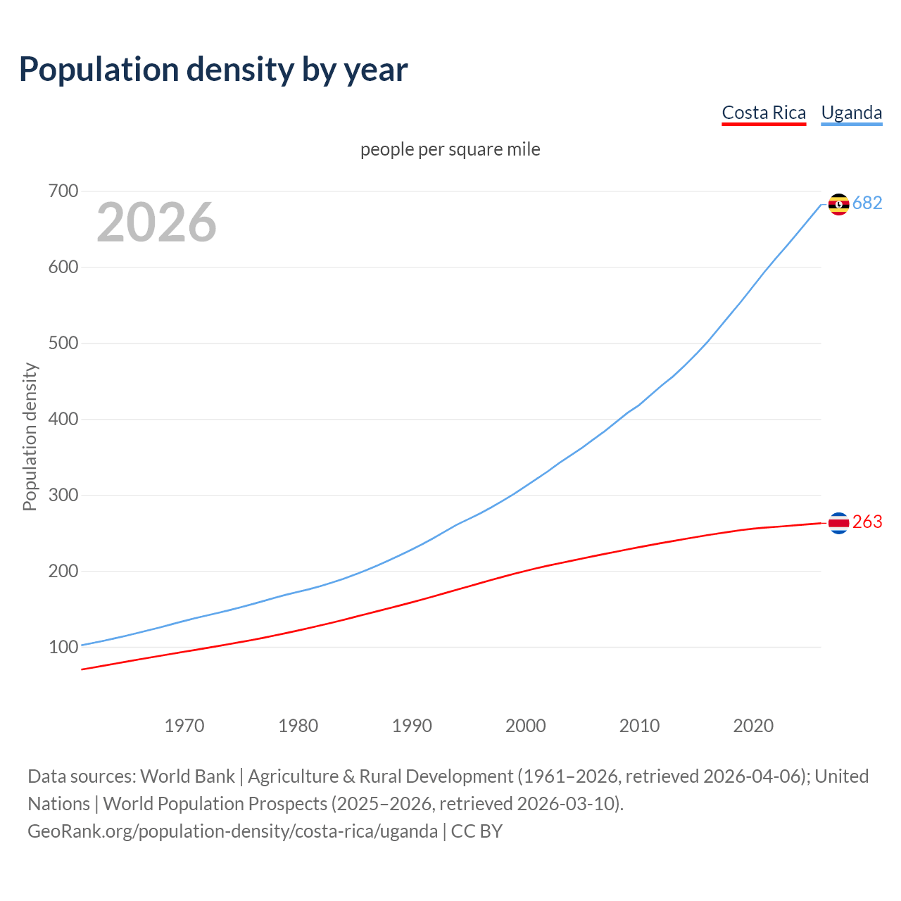 Costa Rica has a population density of 262.6 people per square mile compared to 682 people in Uganda. Costa Rica has 107,389 sq ft of land per person vs 51,875 sq ft in Uganda. Costa Rica and Uganda rank 93rd and 42nd by population density, respectively.