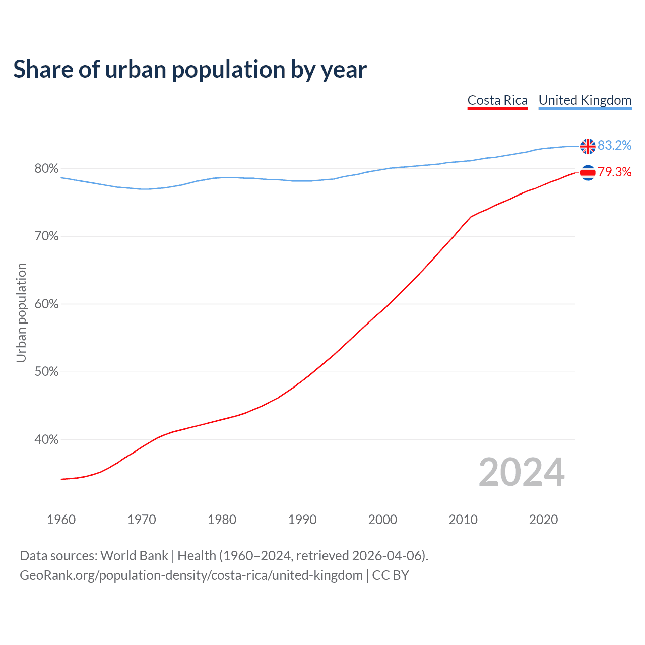 From 2004 to 2024, the share of urban population changed from 63.7% to 79.3% in Costa Rica and from 80.3% to 83.2% in the United Kingdom.