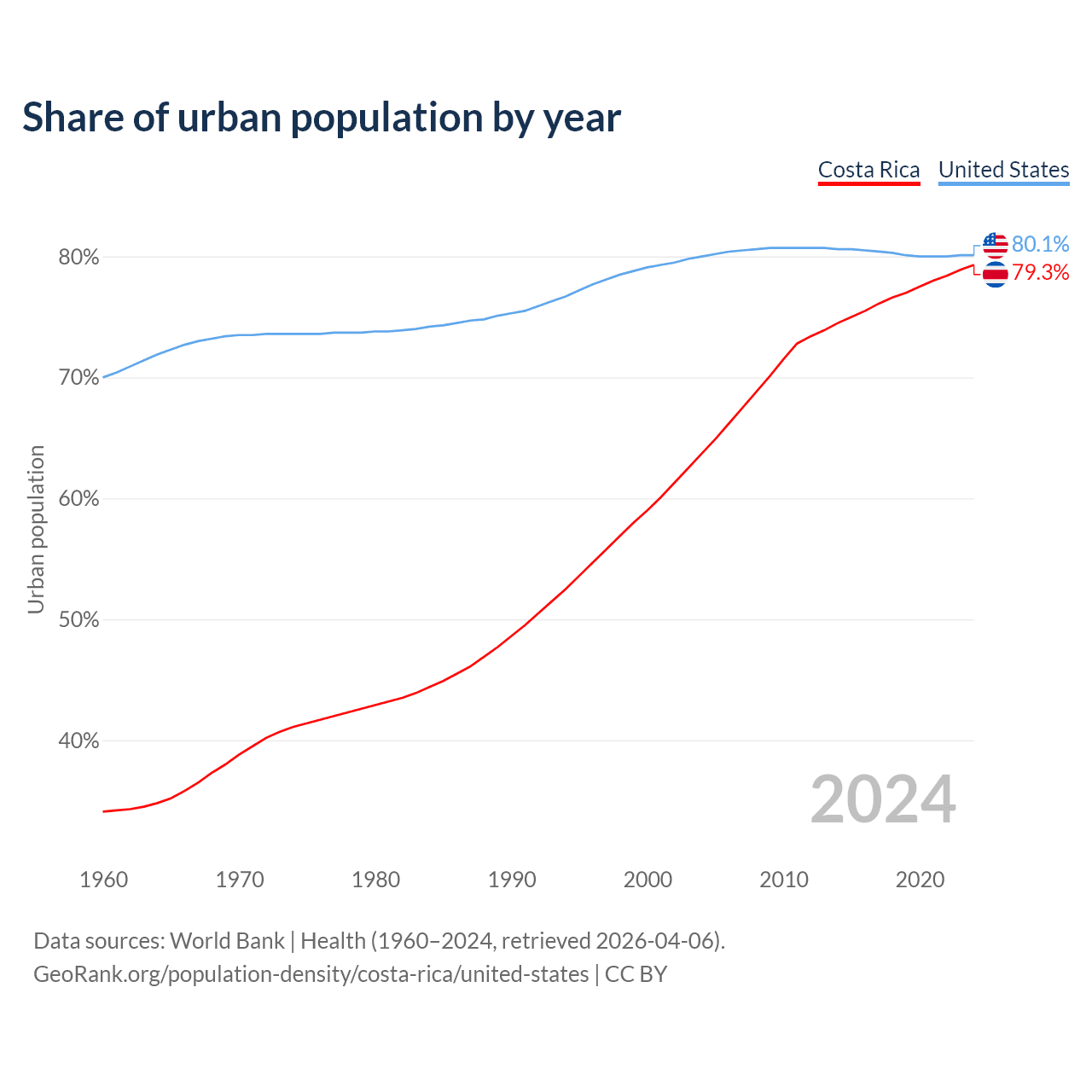From 2004 to 2024, the share of urban population changed from 63.7% to 79.3% in Costa Rica and from 80% to 80.1% in the United States.