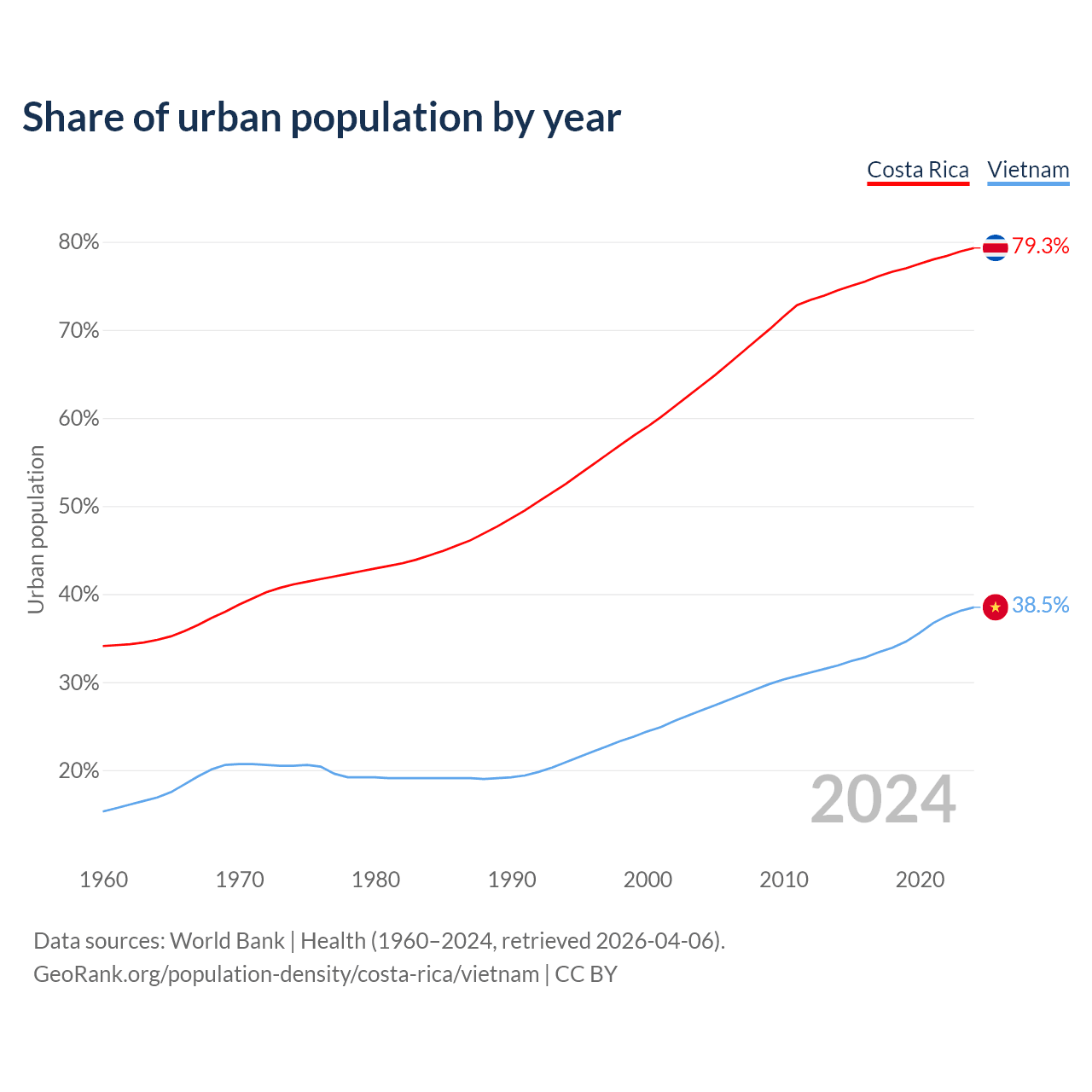 From 2004 to 2024, the share of urban population changed from 63.7% to 79.3% in Costa Rica and from 26.8% to 38.5% in Vietnam.