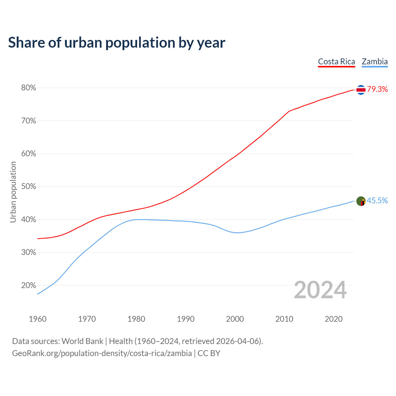 From 2004 to 2024, the share of urban population changed from 63.7% to 79.3% in Costa Rica and from 36.8% to 45.5% in Zambia.
