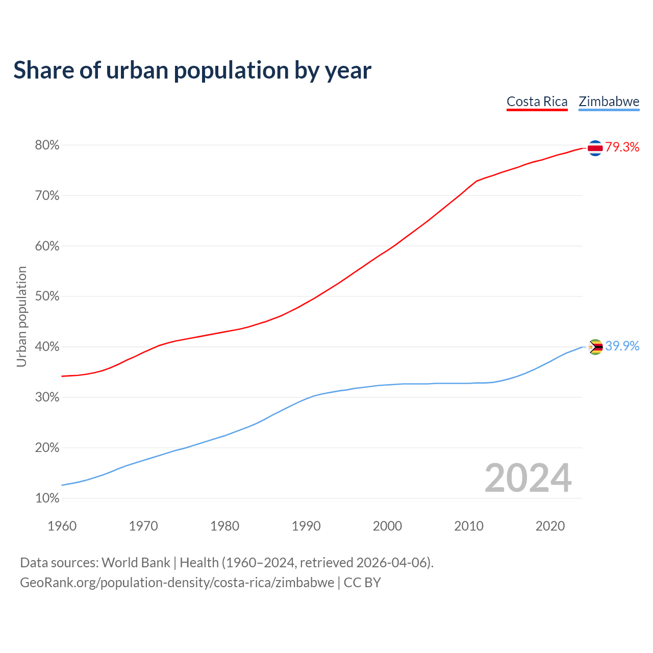 From 2004 to 2024, the share of urban population changed from 63.7% to 79.3% in Costa Rica and from 32.6% to 39.9% in Zimbabwe.