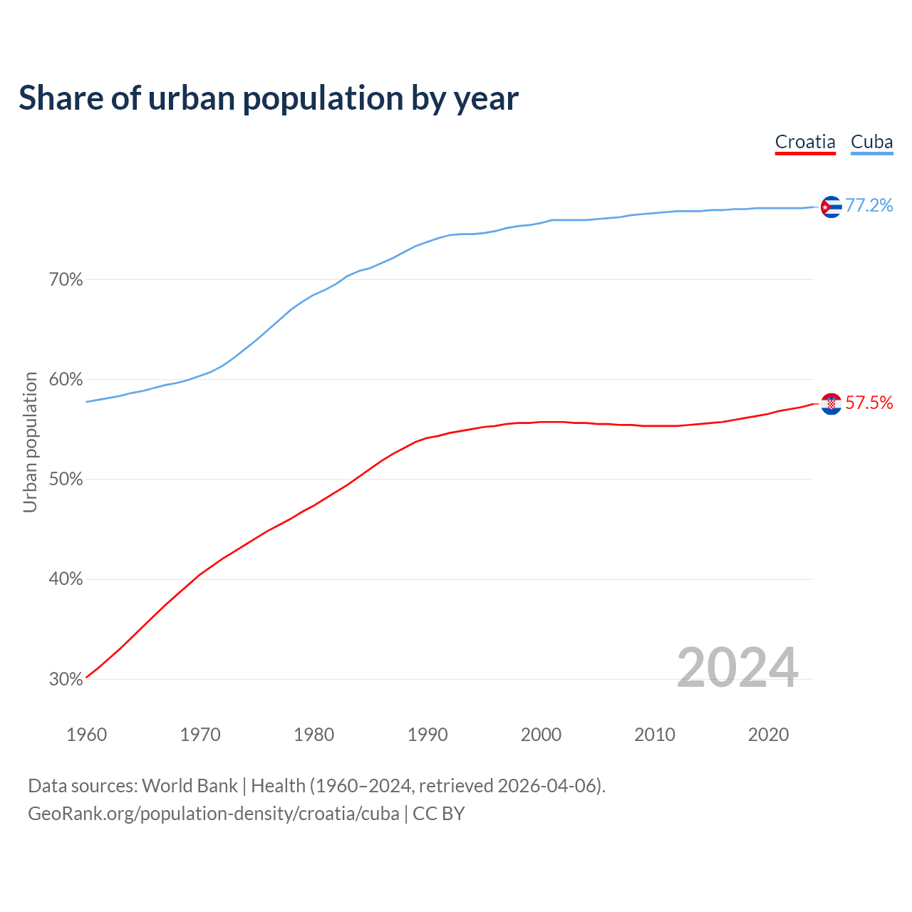 From 2004 to 2024, the share of urban population changed from 55.6% to 57.5% in Croatia and from 75.9% to 77.2% in Cuba.