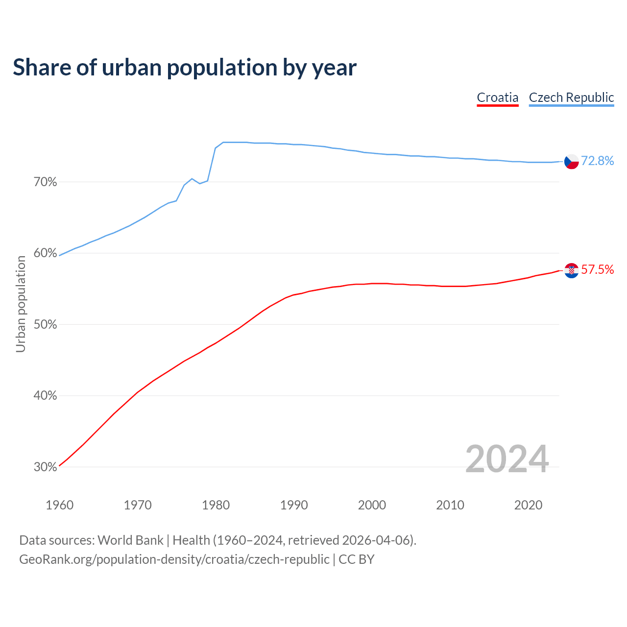 From 2004 to 2024, the share of urban population changed from 55.6% to 57.5% in Croatia and from 73.7% to 72.8% in the Czech Republic.