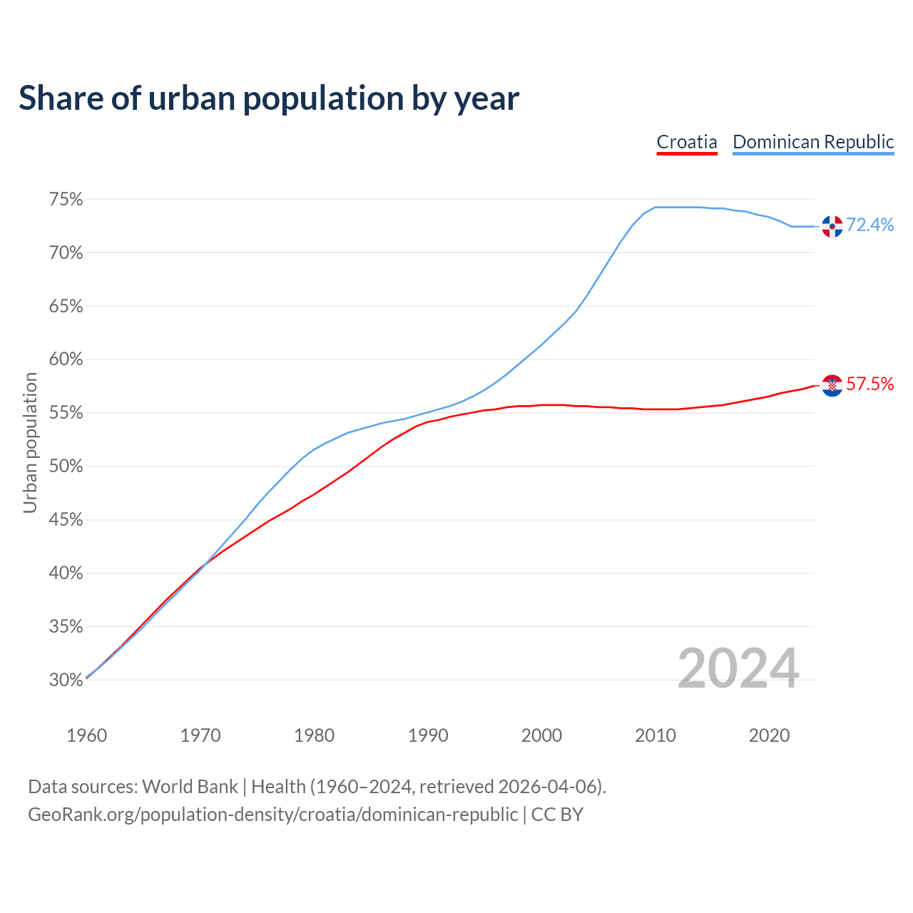 From 2004 to 2024, the share of urban population changed from 55.6% to 57.5% in Croatia and from 65.9% to 72.4% in the Dominican Republic.