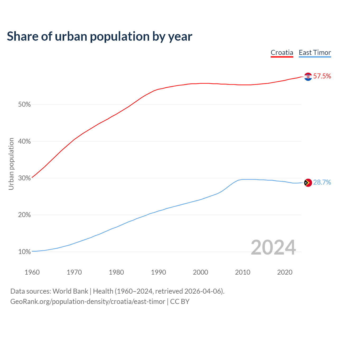 From 2004 to 2024, the share of urban population changed from 55.6% to 57.5% in Croatia and from 25.7% to 28.7% in East Timor.
