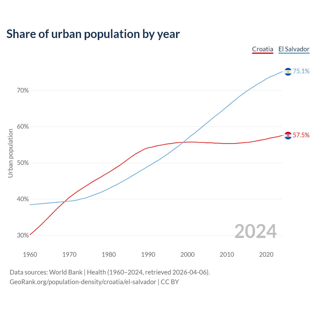 From 2004 to 2024, the share of urban population changed from 55.6% to 57.5% in Croatia and from 60.1% to 75.1% in El Salvador.