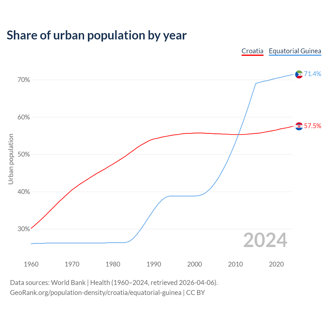 From 2004 to 2024, the share of urban population changed from 55.6% to 57.5% in Croatia and from 40.9% to 71.4% in Equatorial Guinea.
