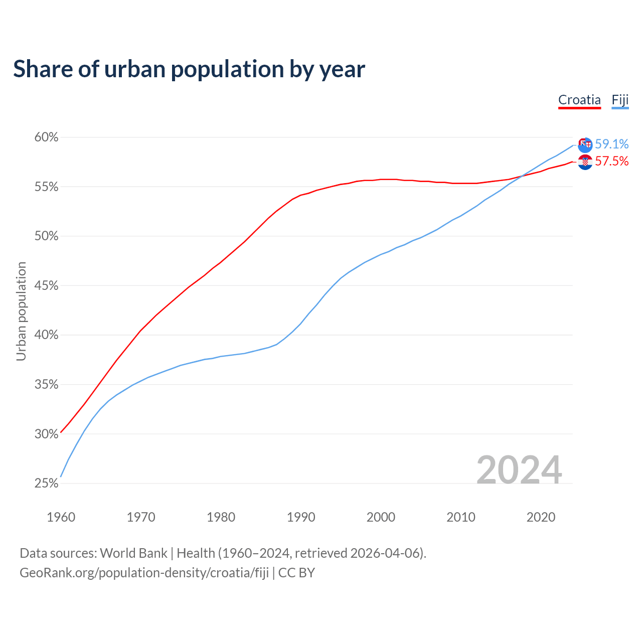 From 2004 to 2024, the share of urban population changed from 55.6% to 57.5% in Croatia and from 49.5% to 59.1% in Fiji.