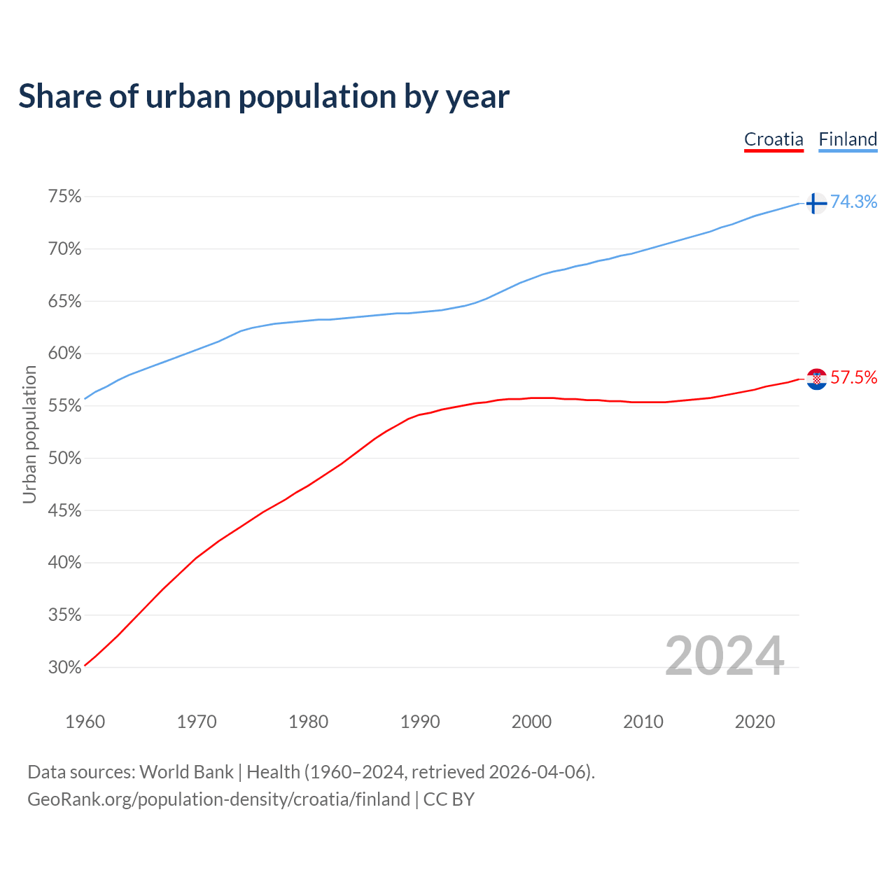 From 2004 to 2024, the share of urban population changed from 55.6% to 57.5% in Croatia and from 68.3% to 74.3% in Finland.