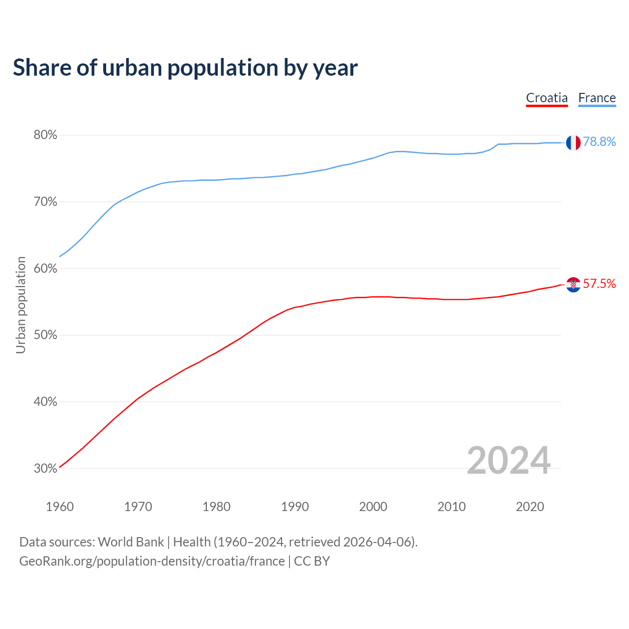 From 2004 to 2024, the share of urban population changed from 55.6% to 57.5% in Croatia and from 77.5% to 78.8% in France.