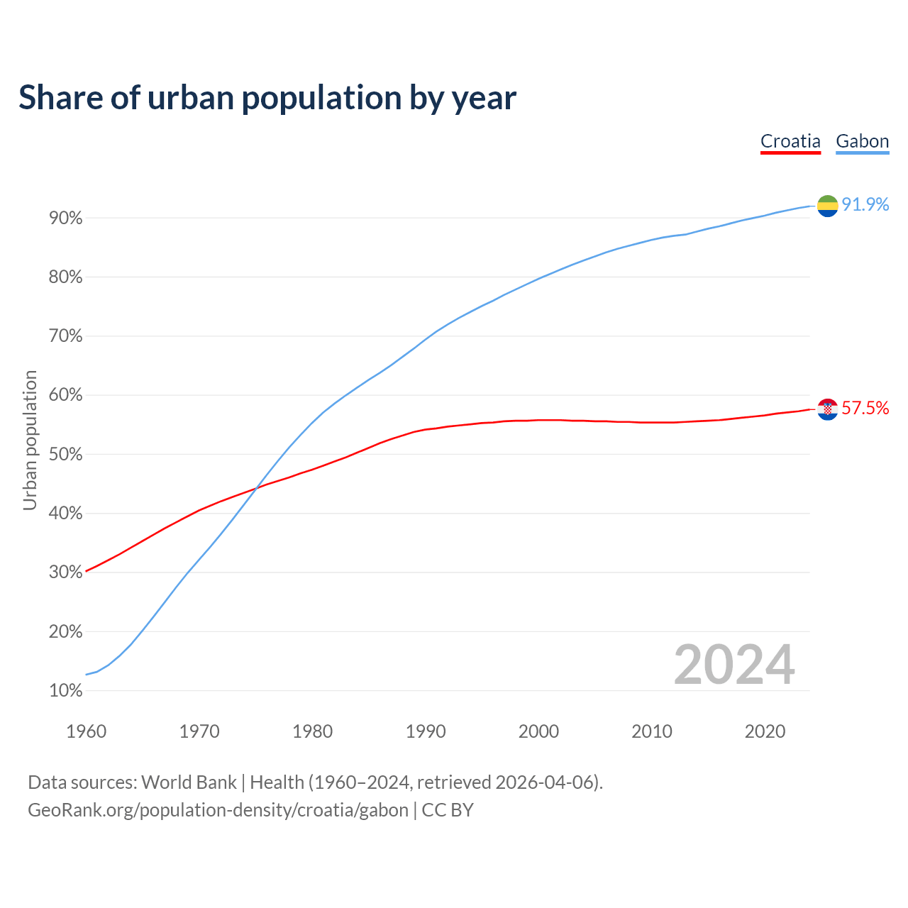 From 2004 to 2024, the share of urban population changed from 55.6% to 57.5% in Croatia and from 82.7% to 91.9% in Gabon.