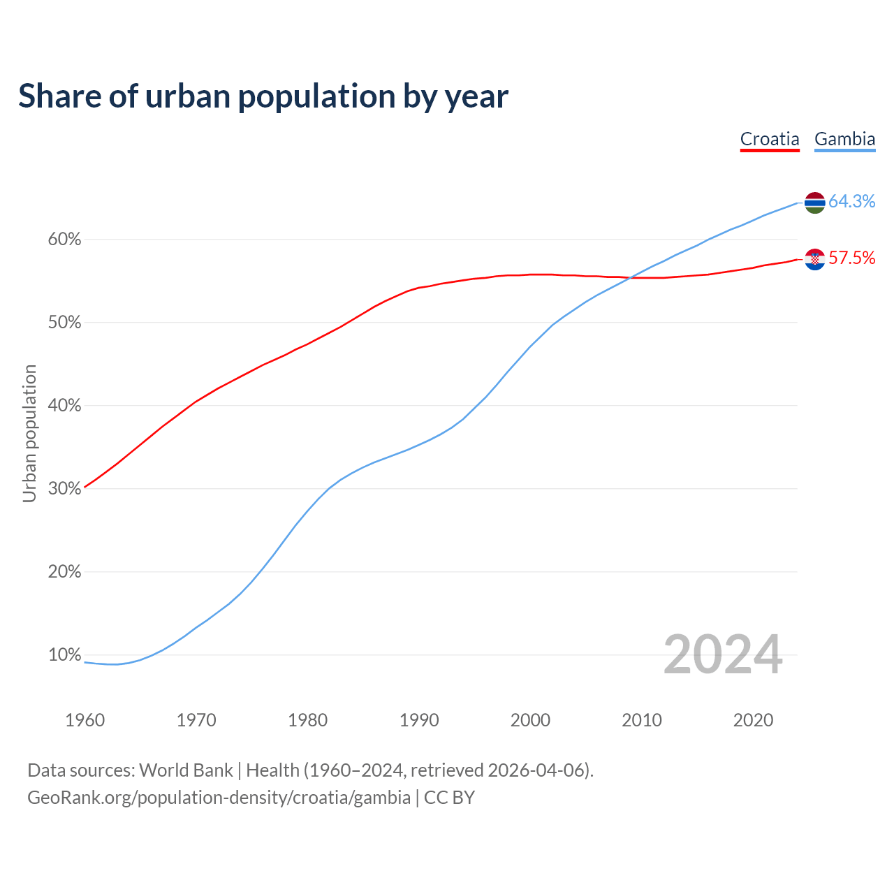 From 2004 to 2024, the share of urban population changed from 55.6% to 57.5% in Croatia and from 51.5% to 64.3% in the Gambia.