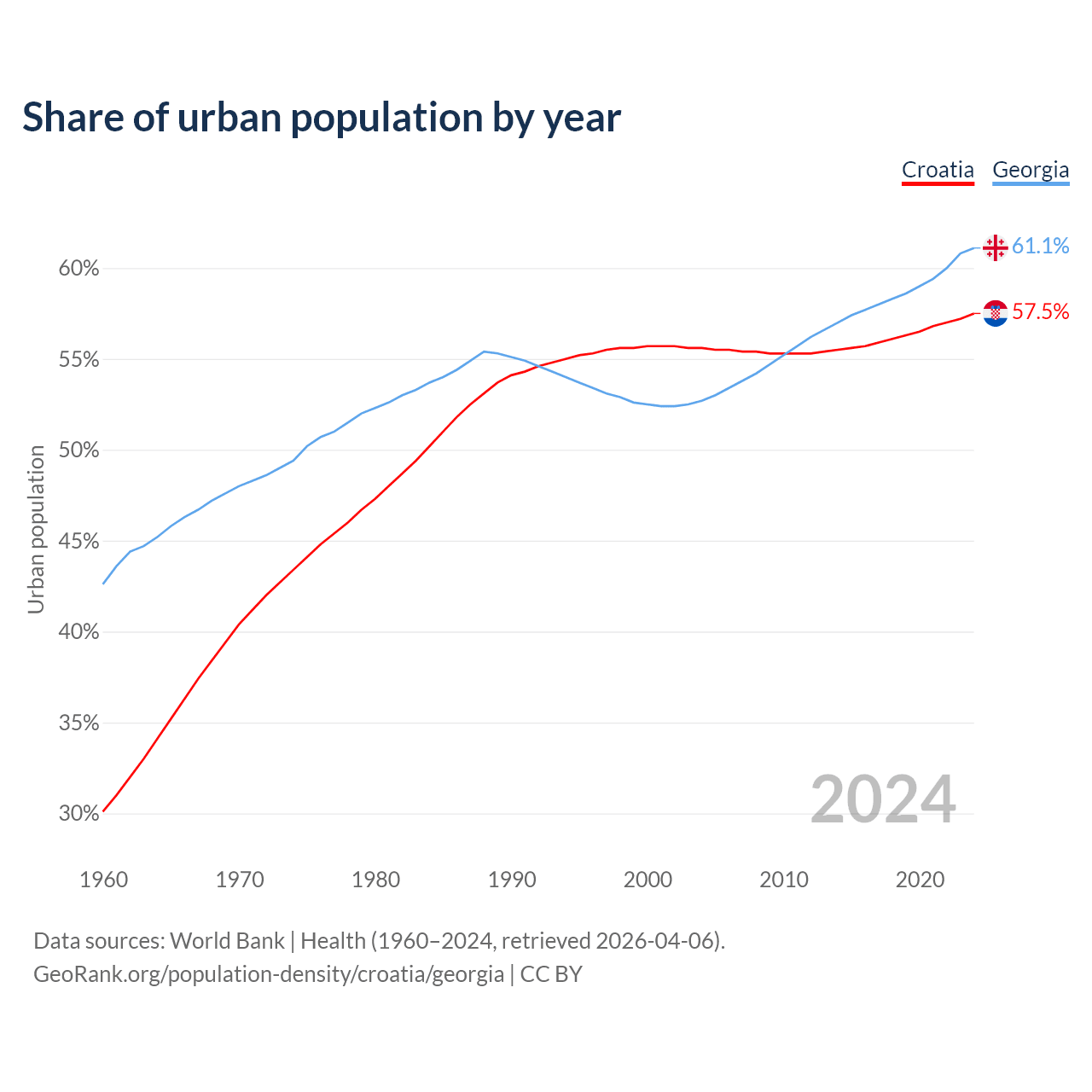 From 2004 to 2024, the share of urban population changed from 55.6% to 57.5% in Croatia and from 52.7% to 61.1% in Georgia.