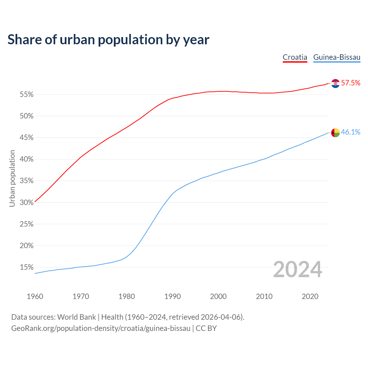 From 2004 to 2024, the share of urban population changed from 55.6% to 57.5% in Croatia and from 38.1% to 46.1% in Guinea-Bissau.