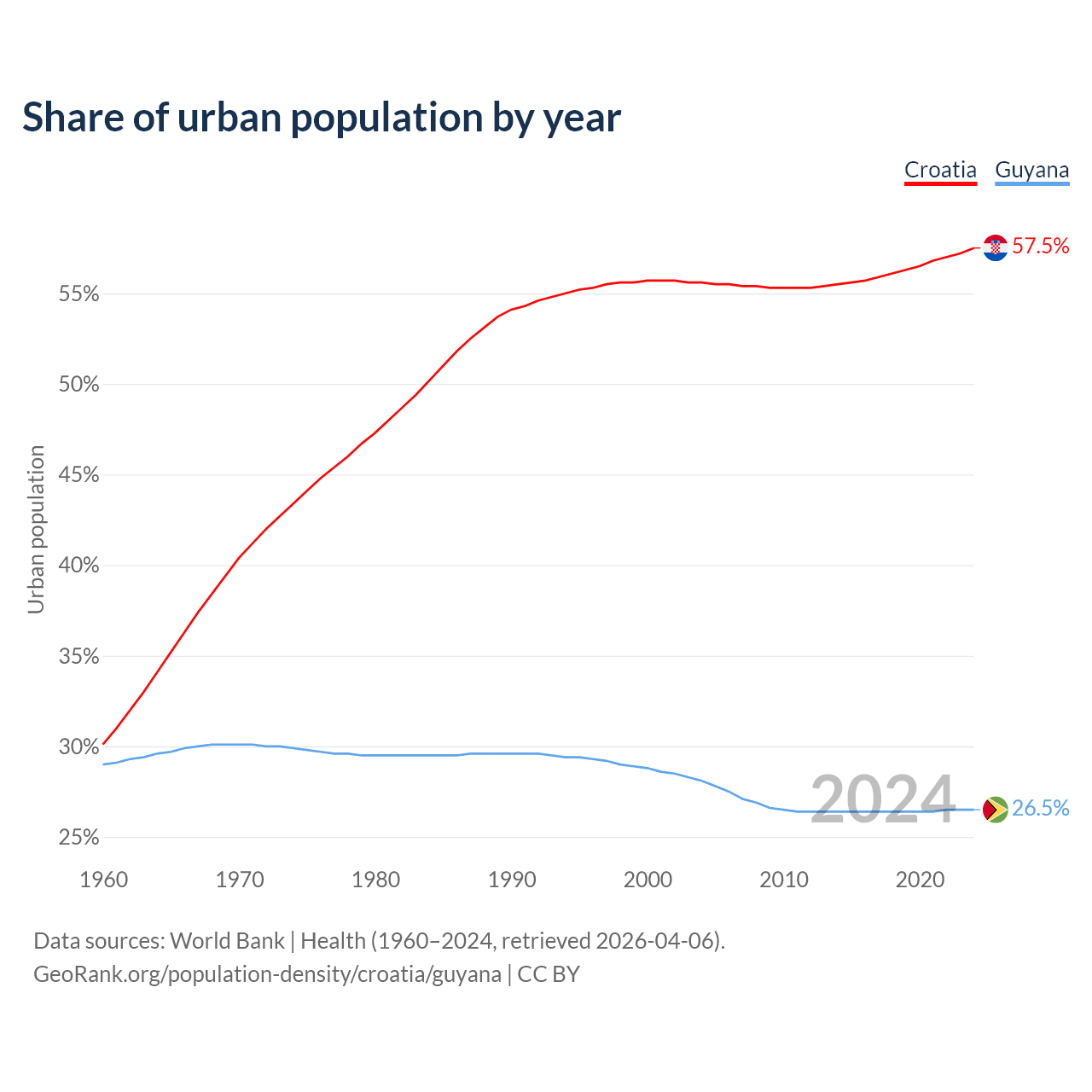 From 2004 to 2024, the share of urban population changed from 55.6% to 57.5% in Croatia and from 28.1% to 26.5% in Guyana.