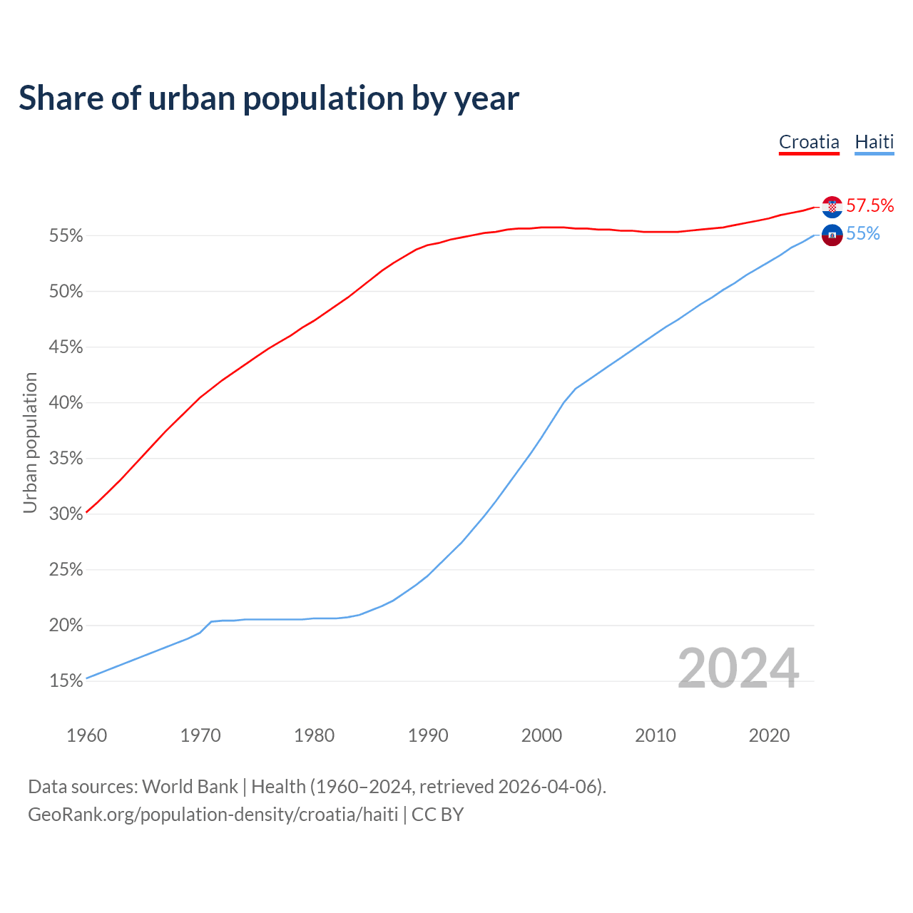 From 2004 to 2024, the share of urban population changed from 55.6% to 57.5% in Croatia and from 41.9% to 55% in Haiti.