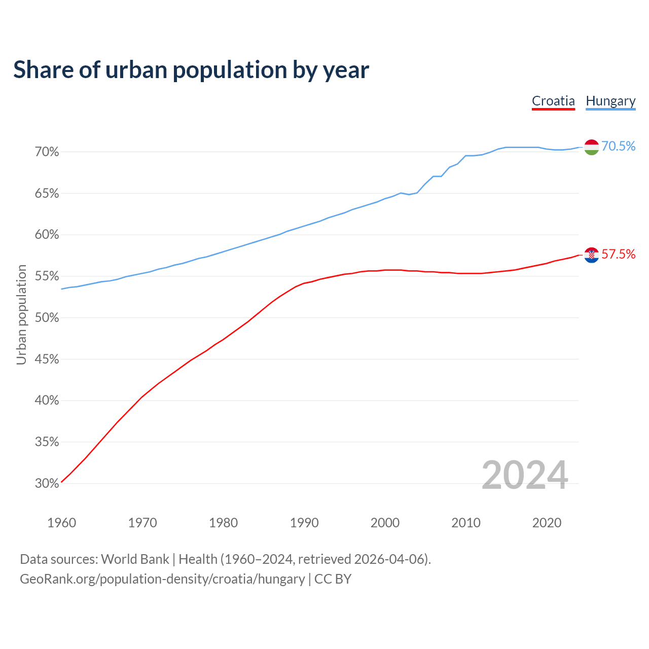 From 2004 to 2024, the share of urban population changed from 55.6% to 57.5% in Croatia and from 65% to 70.5% in Hungary.