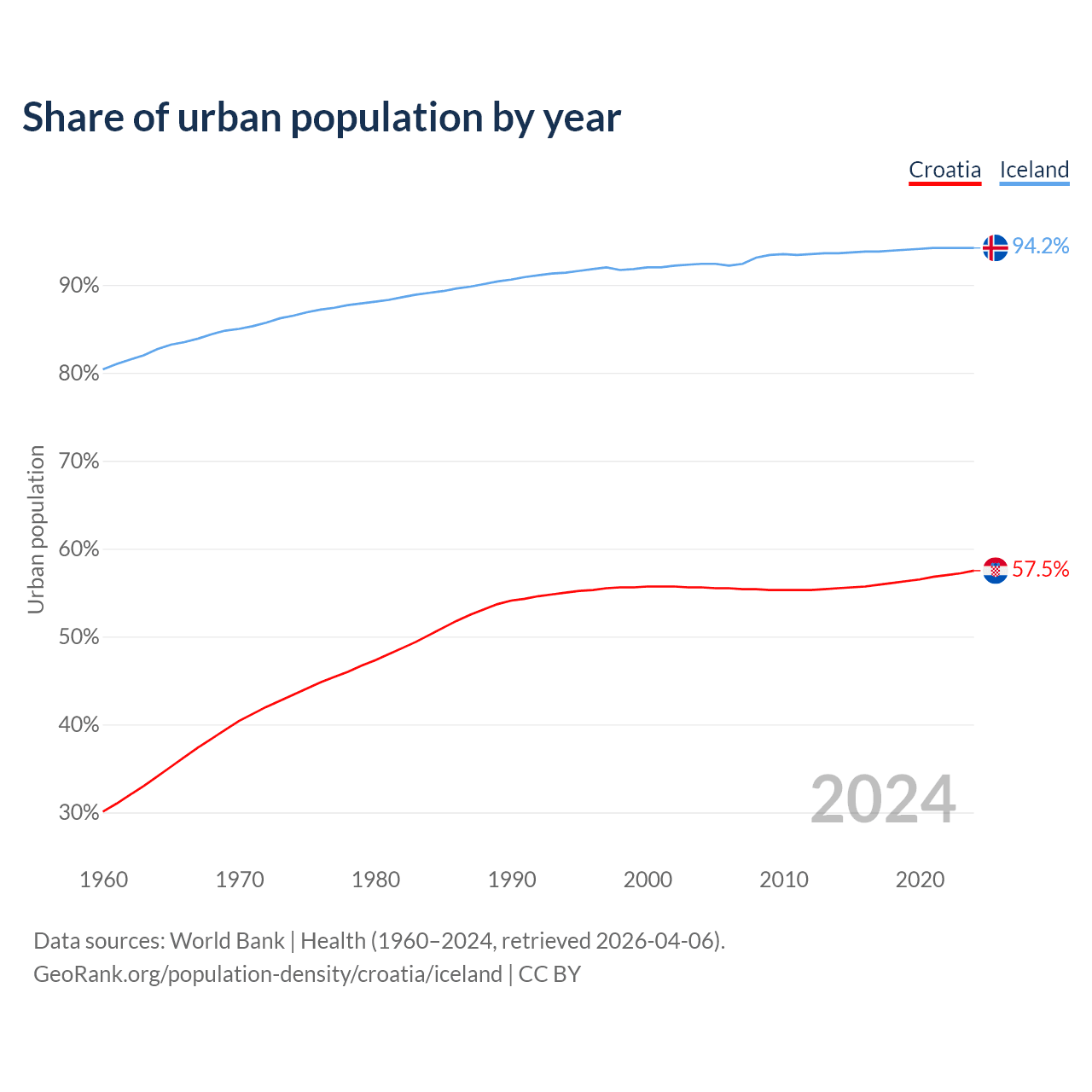 From 2004 to 2024, the share of urban population changed from 55.6% to 57.5% in Croatia and from 92.4% to 94.2% in Iceland.