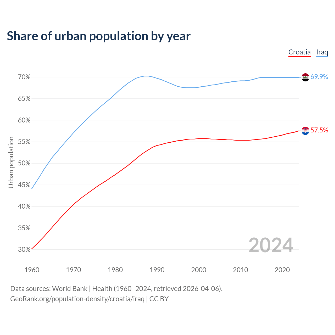 From 2004 to 2024, the share of urban population changed from 55.6% to 57.5% in Croatia and from 68.2% to 69.9% in Iraq.