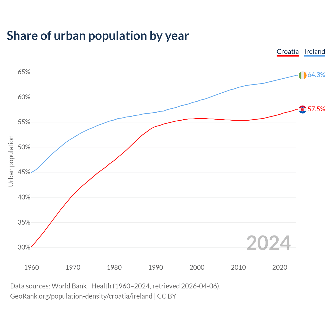 From 2004 to 2024, the share of urban population changed from 55.6% to 57.5% in Croatia and from 60.2% to 64.3% in Ireland.