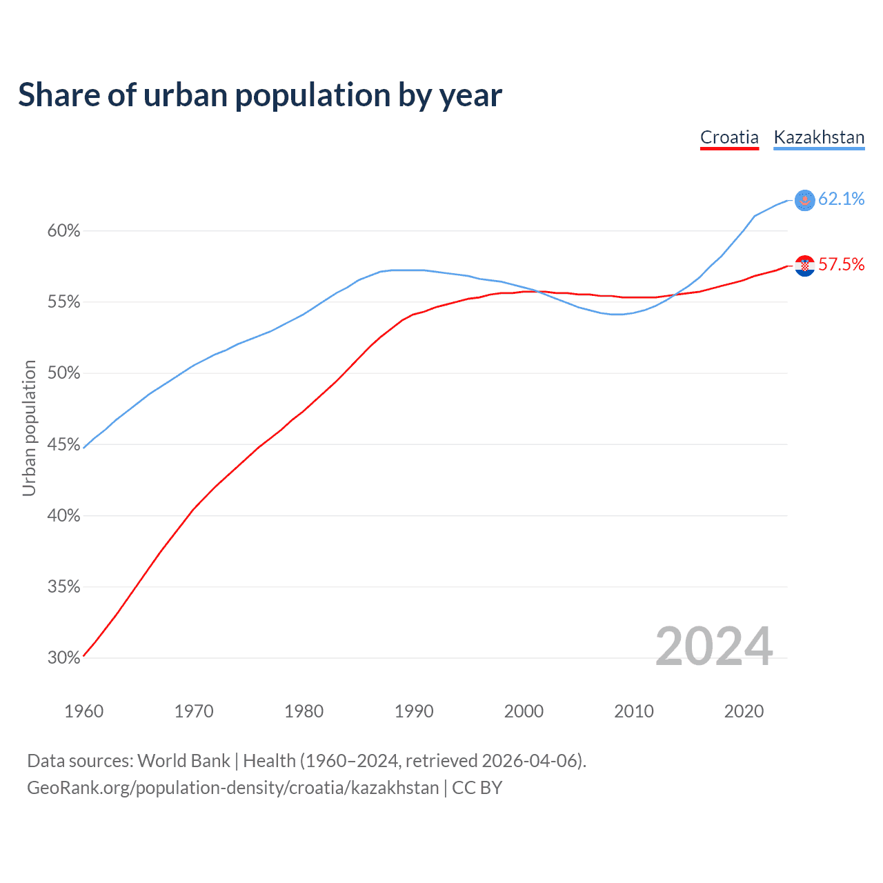 From 2004 to 2024, the share of urban population changed from 55.6% to 57.5% in Croatia and from 54.9% to 62.1% in Kazakhstan.