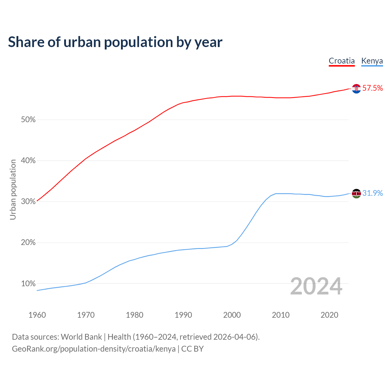 From 2004 to 2024, the share of urban population changed from 55.6% to 57.5% in Croatia and from 25.4% to 31.9% in Kenya.