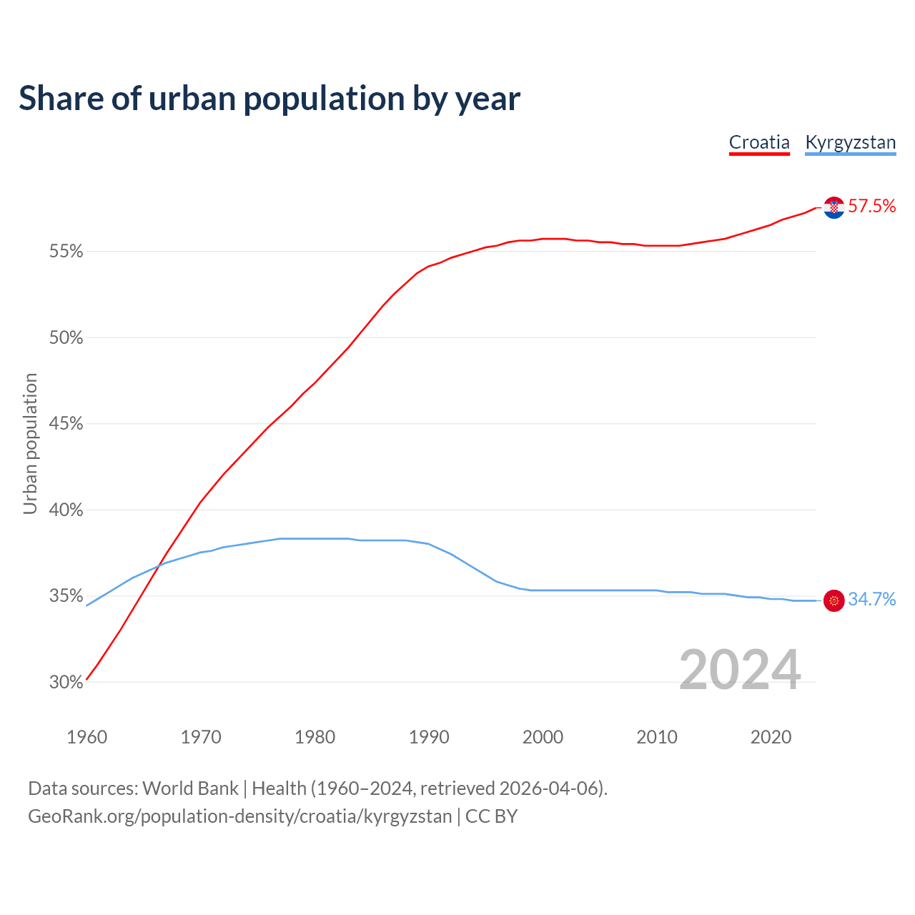 From 2004 to 2024, the share of urban population changed from 55.6% to 57.5% in Croatia and from 35.3% to 34.7% in Kyrgyzstan.
