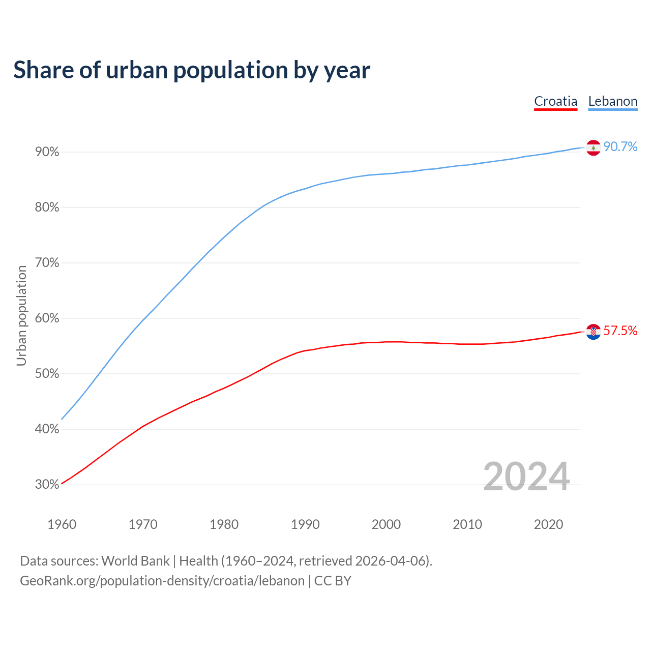 From 2004 to 2024, the share of urban population changed from 55.6% to 57.5% in Croatia and from 86.6% to 90.7% in Lebanon.