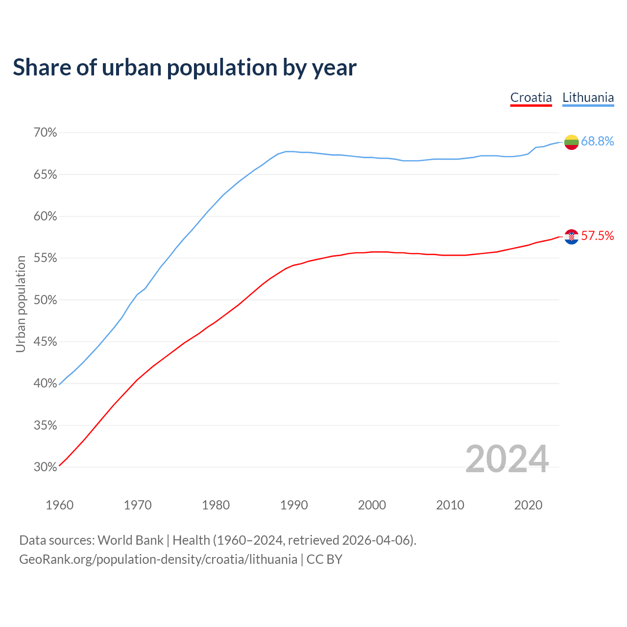 From 2004 to 2024, the share of urban population changed from 55.6% to 57.5% in Croatia and from 66.6% to 68.8% in Lithuania.