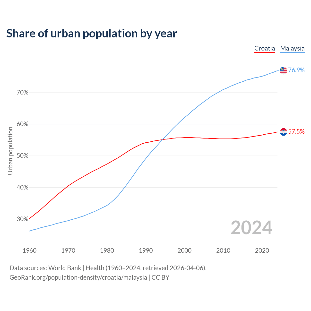 From 2004 to 2024, the share of urban population changed from 55.6% to 57.5% in Croatia and from 66.1% to 76.9% in Malaysia.