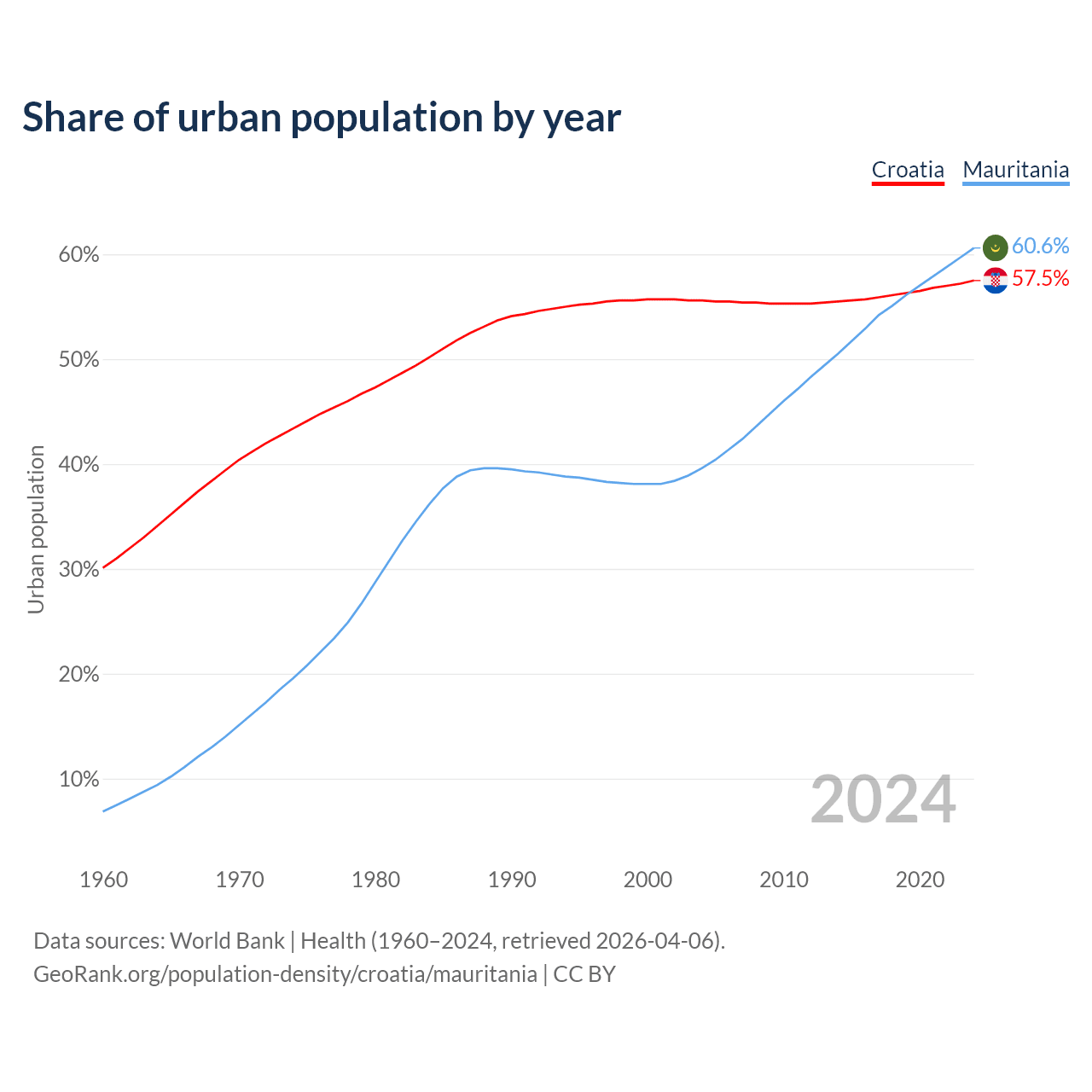 From 2004 to 2024, the share of urban population changed from 55.6% to 57.5% in Croatia and from 39.6% to 60.6% in Mauritania.