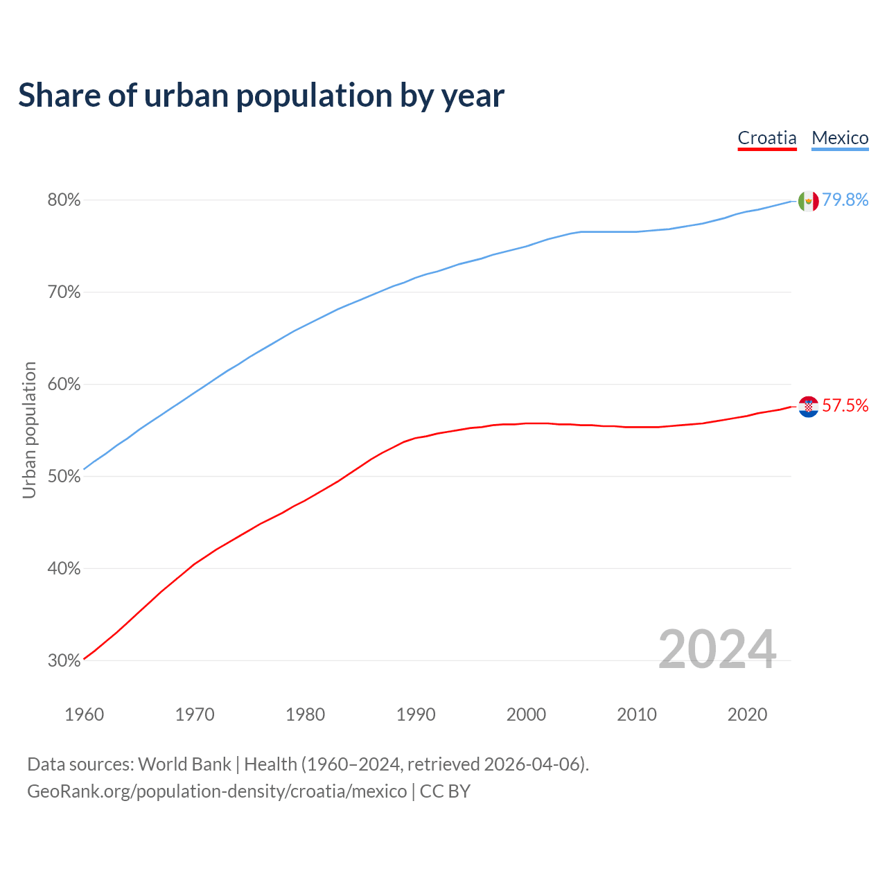 From 2004 to 2024, the share of urban population changed from 55.6% to 57.5% in Croatia and from 76.3% to 79.8% in Mexico.